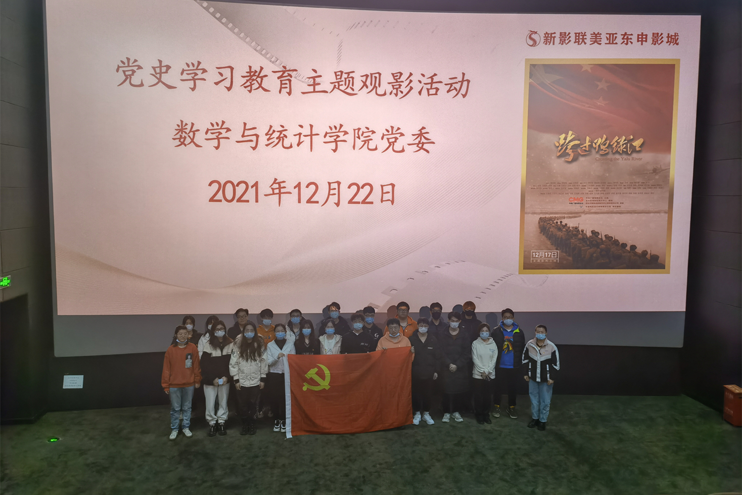 12月21日、22、23日,数学与统计公司党委组织师生党员和入党积极分子观看了《跨过鸭绿江》,重温那段战火纷飞的历史,感受志愿军战士英勇无畏、舍生忘死、保家卫国的英雄主义精神。
