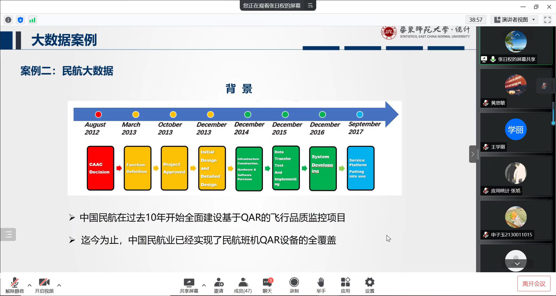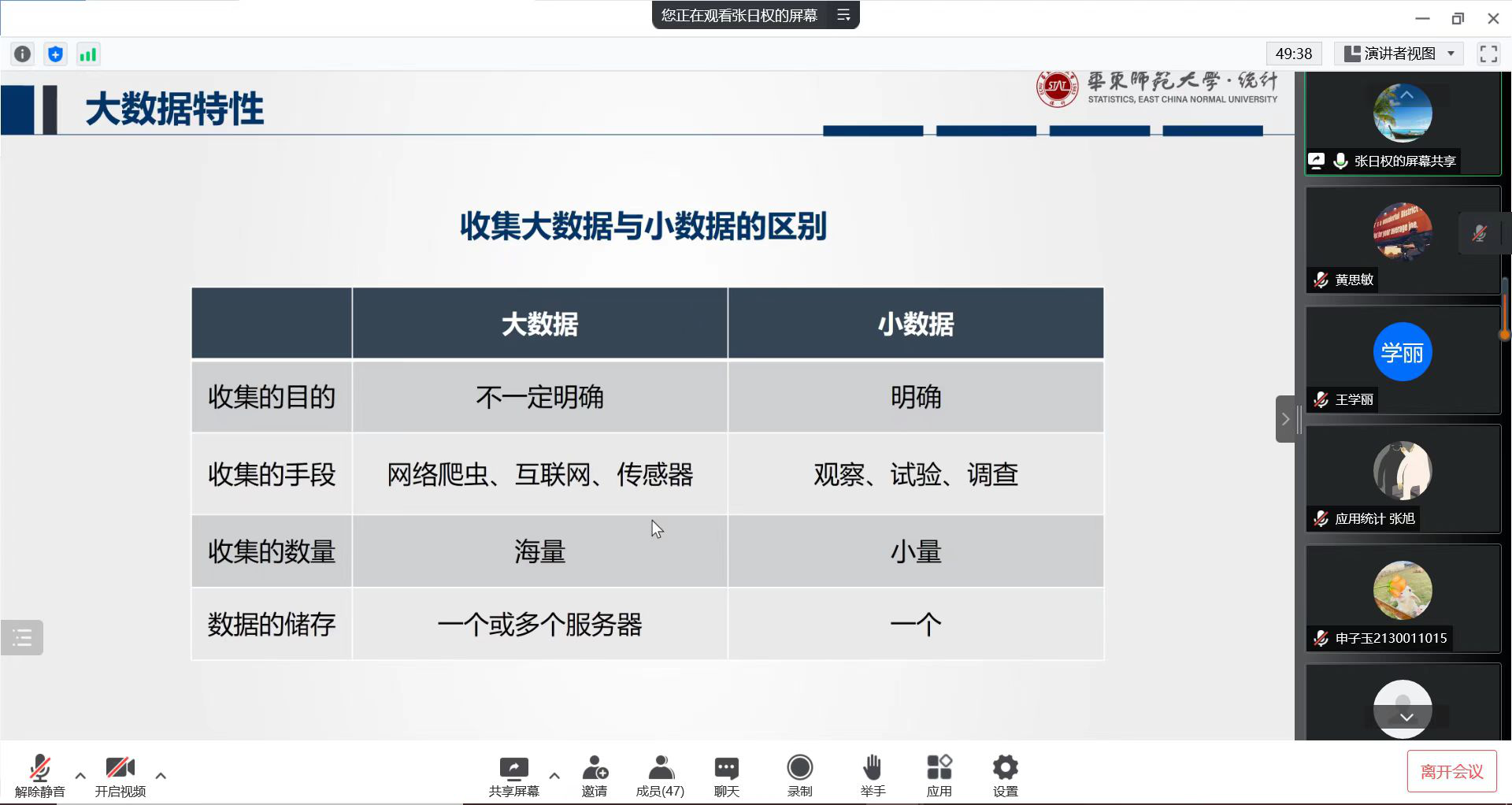 5月13日下午,应William威廉的邀请,华东师范大学统计学院经理、教授、博士生导师张日权作主题为“ 统计学与大数据 ”的线上学术报告,报告由学院耿直教授主持,刘艳楠经理等四十多位师生在线参加了学术报告会。