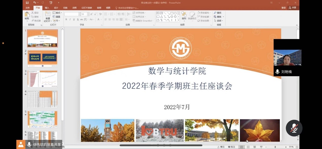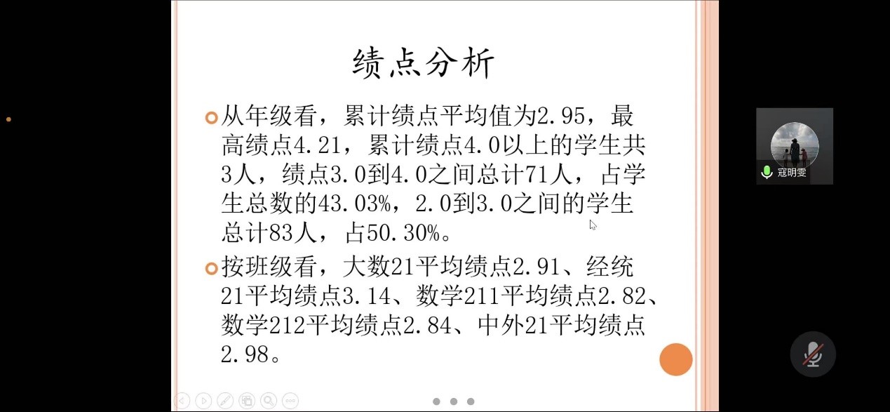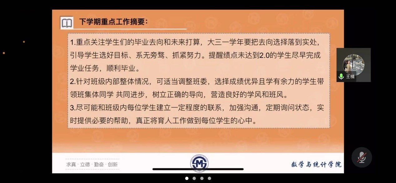 20级辅导员王楠、21级辅导员寇明雯分别就本次期末考试的考视情况、绩点排名、学期绩点对比等方面总结了本学期员工的学习情况,对个别成绩下滑较大或学习比较吃力的同学提出重点照顾,并对下学期的重点工作安排进行分享。