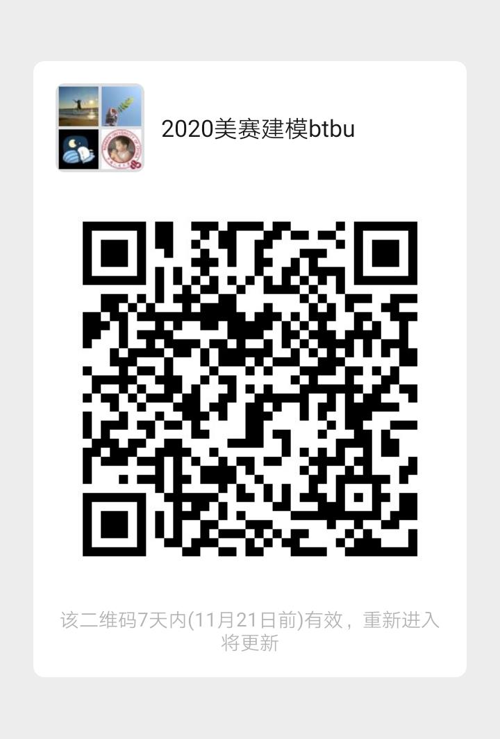 4.2由各参赛队队长扫描文后二维码进入微信群,以便接收学校通知;如无法进群,则添加微信号zhq91027,注明姓名、学院及2020美赛。后期培训及竞赛相关信息会在群里发布。