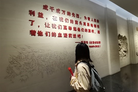 跟随自助语言讲解,同学们走进纪念馆大厅,依次参观了中国局部抗战、全民族抗战、中流砥柱、日军暴行、东方主战场、得道多助、伟大胜利、铭记历史8个部分。大量的史料、丰富的实物、生动的影像全面展示了在中国共产党的指引下,中华民族众志成城奋勇抗战最终取得胜利的过程,同学们仿佛听到了抗战军民为了保家卫国发出的震耳欲聋的大吼,仿佛看到了革命先辈们顽强战斗不怕牺牲的场面,对抗日战争历史和抗战精神有了更加深刻的了解。