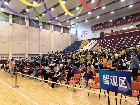 接种过程中,同学们严格遵守防疫要求,全程佩戴口罩,保持一米间距,有序排队配合医务人员完成疫苗接种工作。进入文体馆三层后,测量体温,领取并填写知情同意书,进行有序接种。疫苗接种完成后在留观区观察30分钟后离开。整个接种过程迅速有序、安全高效。