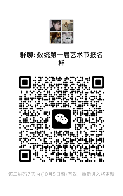 第二步:扫码进入下方“数统第一届艺术节报名群”,后续彩排及其他相关通知将在群中发布。