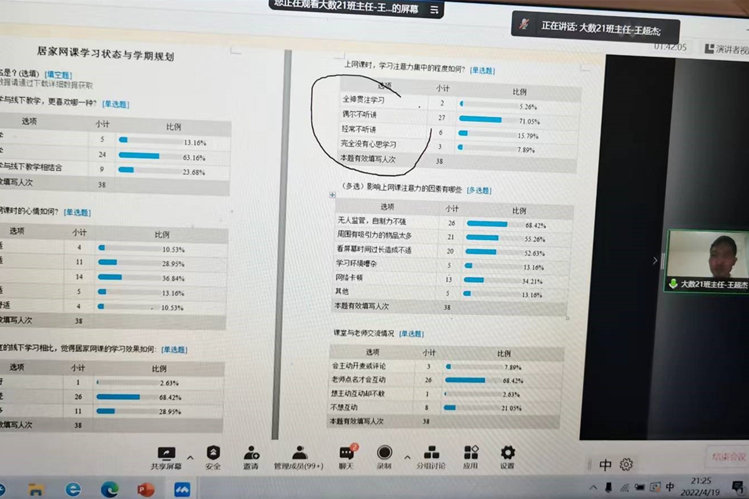 大数21班主任王超杰老师开展了居家学习现状调查,鼓励同学们参加学术竞赛,灵活运用所学知识,“脚踏实地,仰望星空”,做好个人规划,他向家长们提出了“解决问题>倾听问题>提出问题>不关心”这一建议,在居家学习这段时间尽可能为员工提供良好的学习氛围。