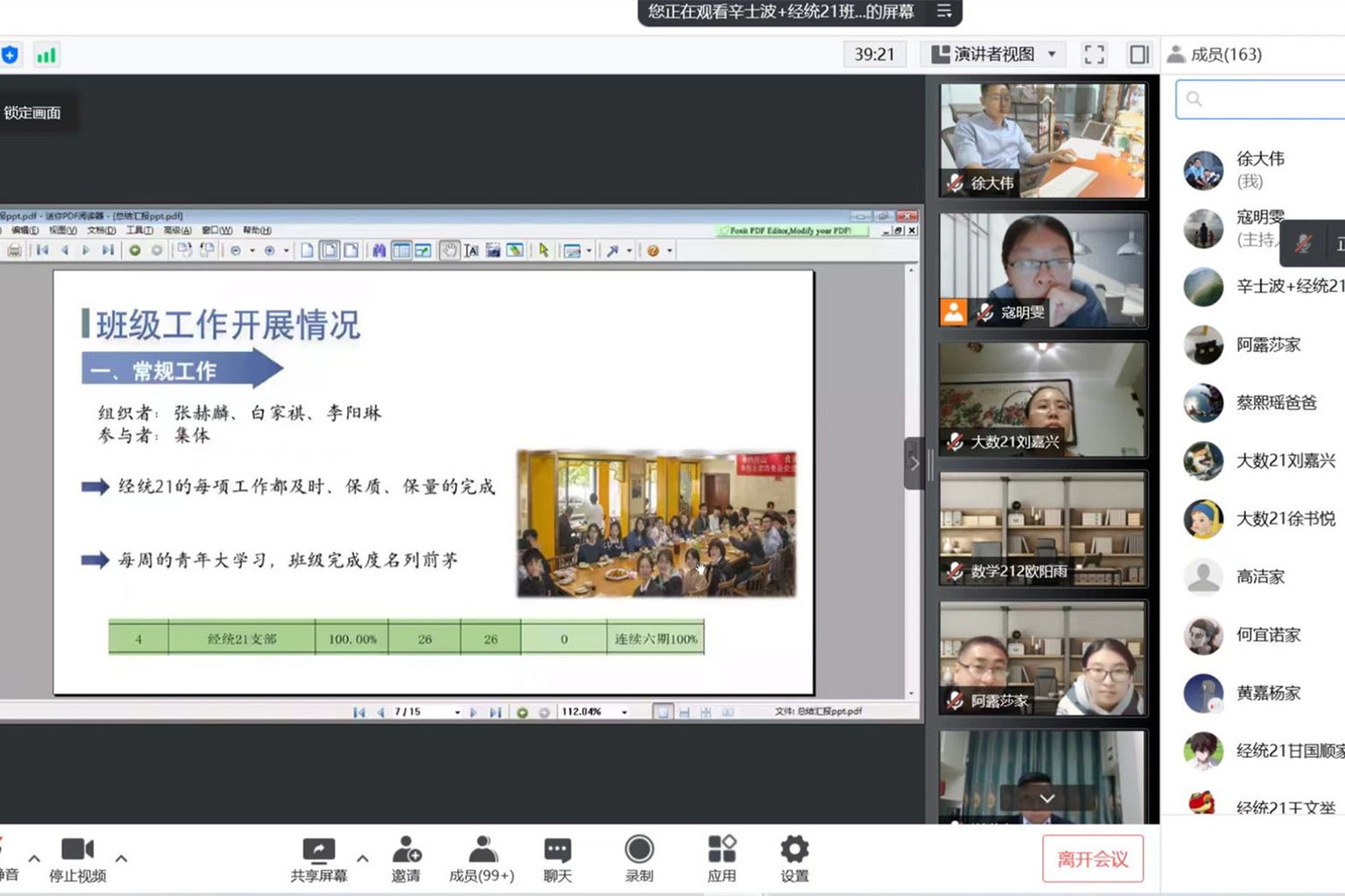 经统21班主任辛士波老师从学业情况、团队建设等方面汇报了班级工作开展情况,他希望同学们养成好的学习习惯,培养完善的思维体系,并鼓励员工和家长相信抗击疫情一定能取得胜利,希望同学们要坐得住板凳,待得住寂寞,家长们适当监管督促员工线上学习。