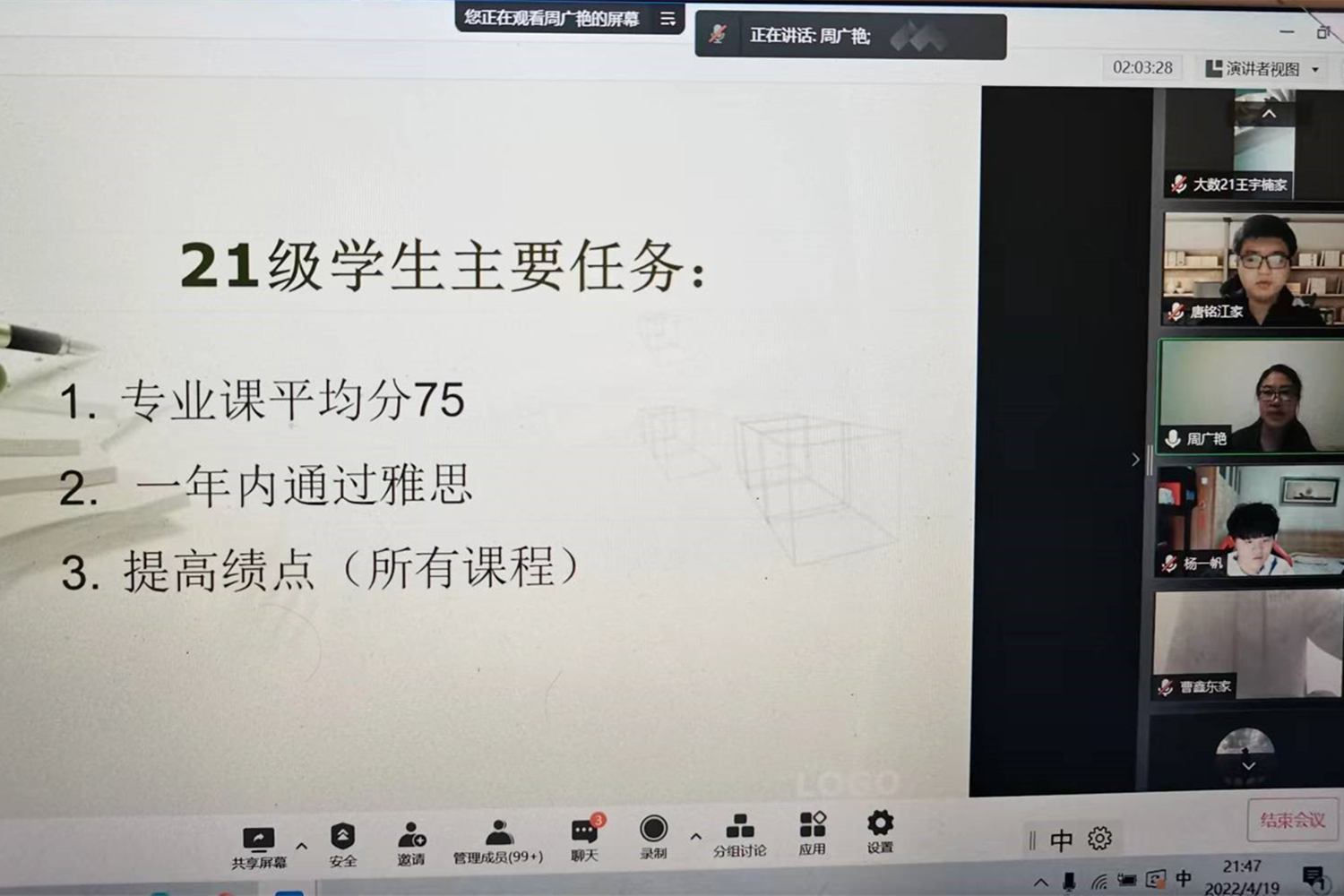应统21中外班主任周广艳老师谈了网课教学中存在的主要问题,介绍了学院中外合作项目的情况,展示了中外班往届员工的风采和毕业情况,她指出,现阶段,中外班员工要保证专业课平均分75分的最低标准、一年内通过雅思、提高绩点。