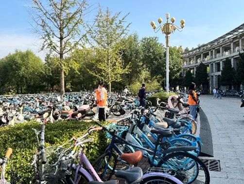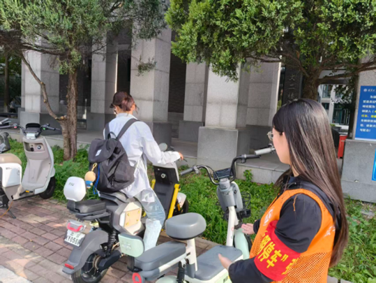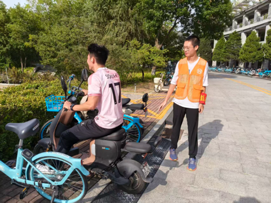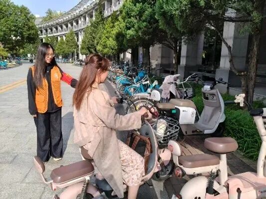 9月26日,志愿者们身穿代表数统学院的橘色马甲,来到教学区主干道上的执勤点位。每一次的细心提示、每一次的耐心指引,都如同温暖的春风,吹进了每一位同学的心中,在他们的努力下,非机动车的停放变得更加有序,原本杂乱无章的停车区变的整齐划一。
