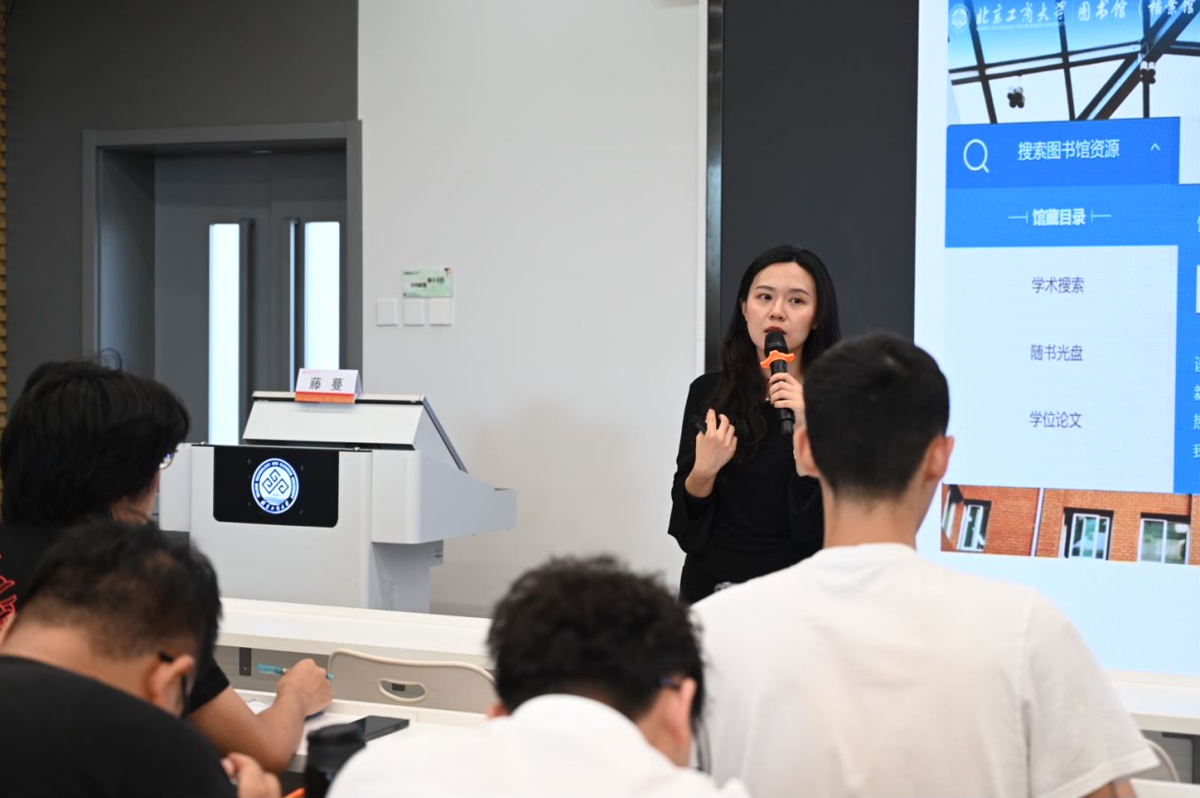 图书馆参考咨询部主任藤蔓老师介绍了数据库的使用方法,鼓励同学们充分利用图书馆丰富的资源,她结合自己的求学和科研经历细致讲解了如何运用高质量的文献资源提升学术研究的深度与广度。她提到:“科研是一段漫长而充满挑战的旅程,唯有耐心钻研,合理运用资源,才能在学术的海洋中找到自己的方向。”她强调了学术诚信和严谨的重要性,指出,在使用文献资源时应注意引用规范和信息的可靠性。