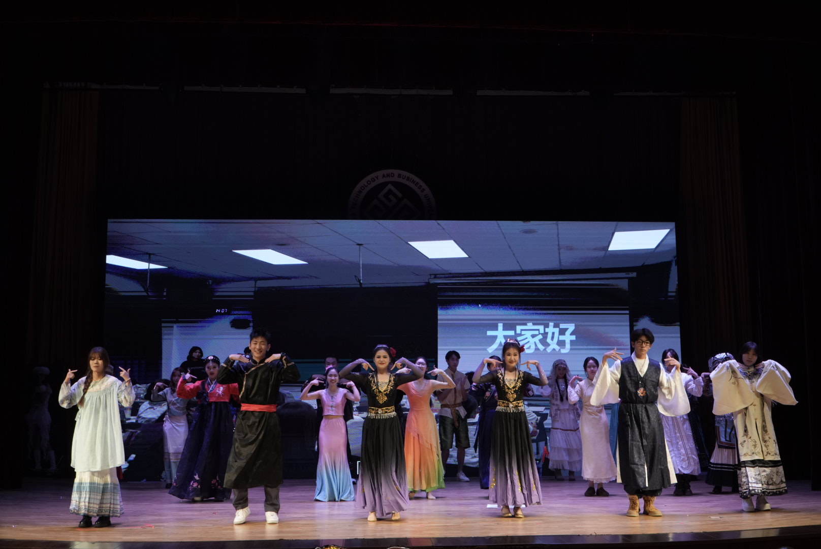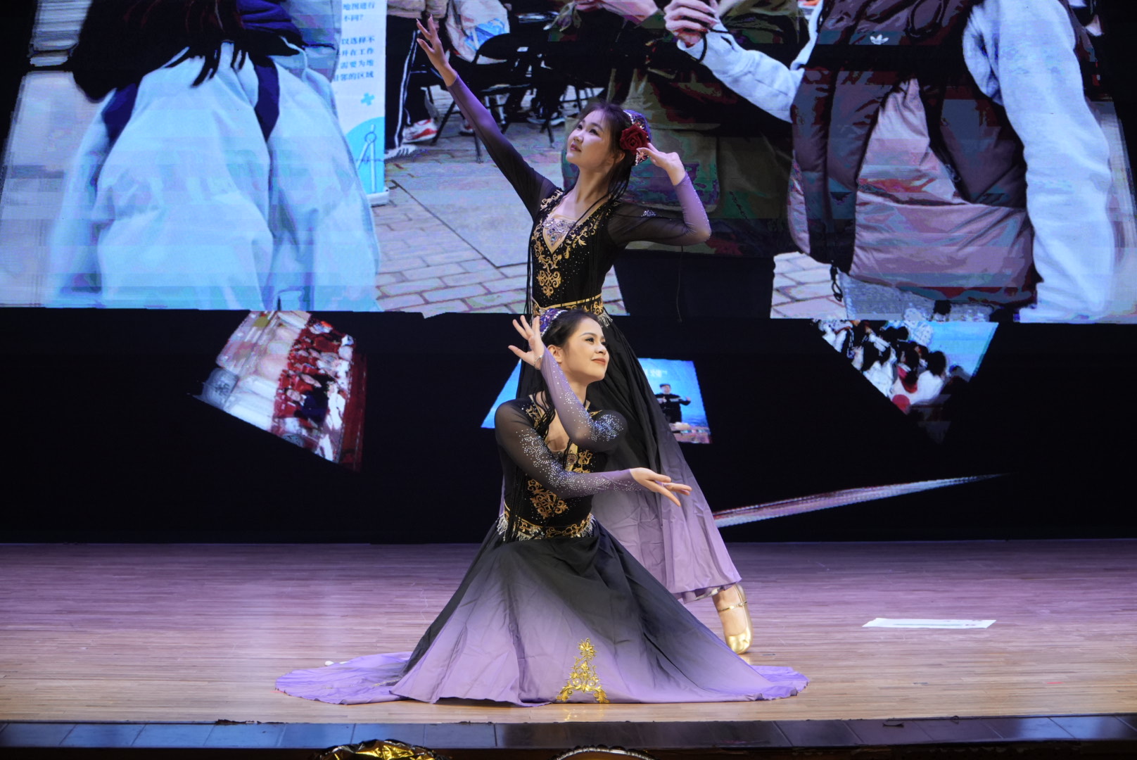 晚会安可环节成为全场温情高潮。舞蹈《石榴花开》以优美舞姿展现民族风情与团结之美,商英231阿丽米热、软件232阿依萨纳木等舞者的表演如同盛开的石榴花般绚烂,寓意着数统学子像石榴籽一样紧紧相拥、凝聚一心。
