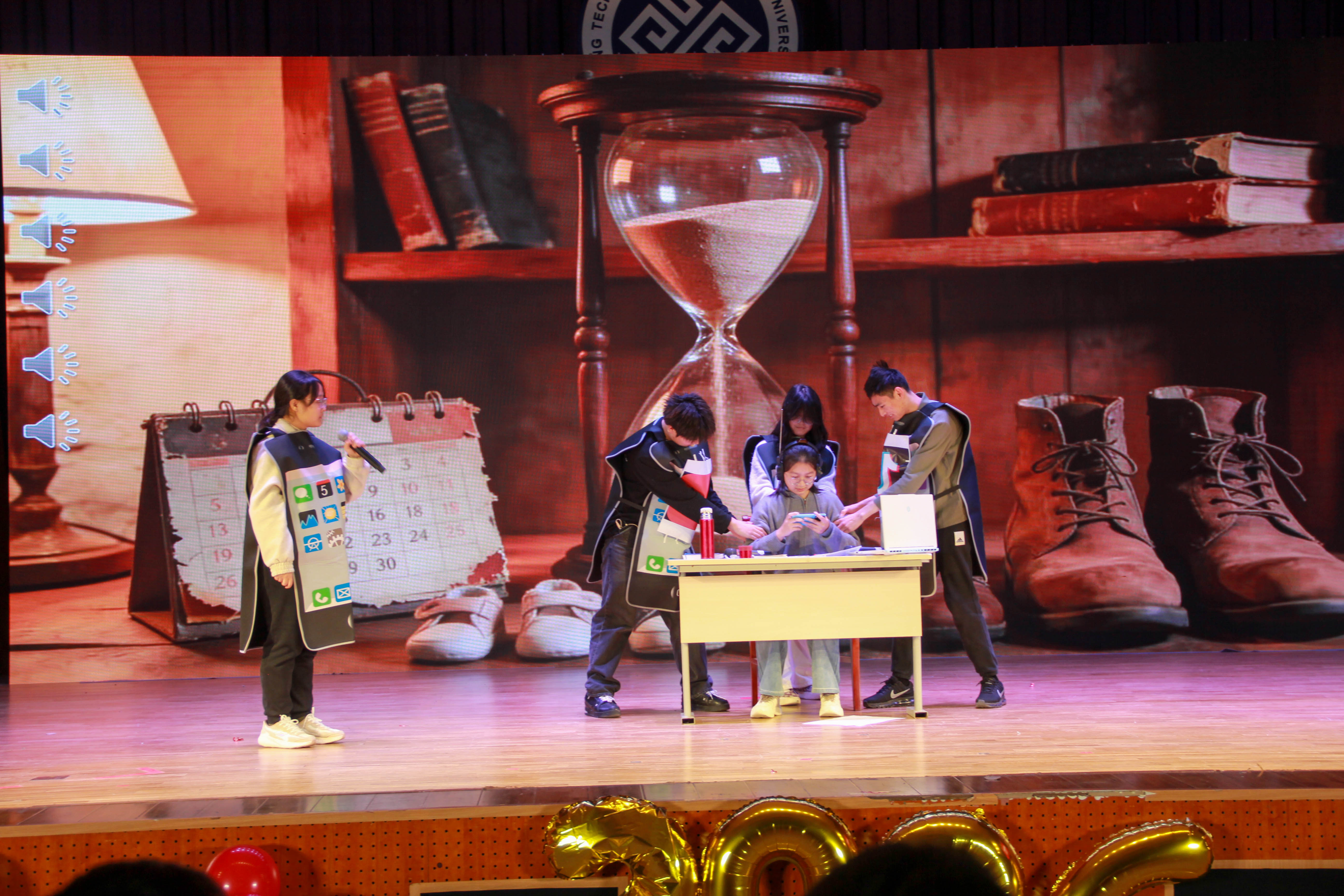 第四篇章“续章·逐梦新程”以情景剧《时间都去哪儿了》启幕,由应统252王鑫宇、计算机253纪皓泽、数学252刘滢菲、数学251杨晨、大数251郭安琪、大数251程子桐倾情演绎。主角小陈想学习却被手机裹挟,陷同辈压力焦虑,经“理想我”等点醒,借“时间支出统计”认清问题,最终觉醒掌控手机、专注学习。剧情贴近校园生活,幽默又戳心,引发强烈共鸣,让学子们深刻领悟到管理注意力、把握时间主导权的重要意义。