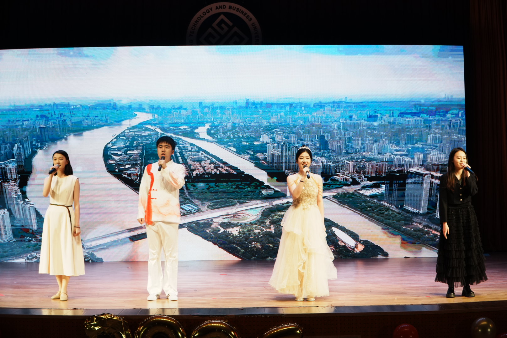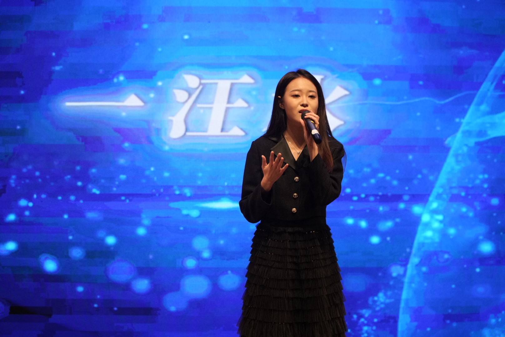 第三篇章“盛章·才思芳华”的开启,让晚会的文艺氛围再度升级。歌曲《天海一心》的旋律缓缓响起,应统中外24赵一橙用悠扬的歌声勾勒出数统学子心向远方、携手同行的情怀,歌声中饱含的集体归属感与追梦热忱,让观众沉浸在这份温暖意境里。