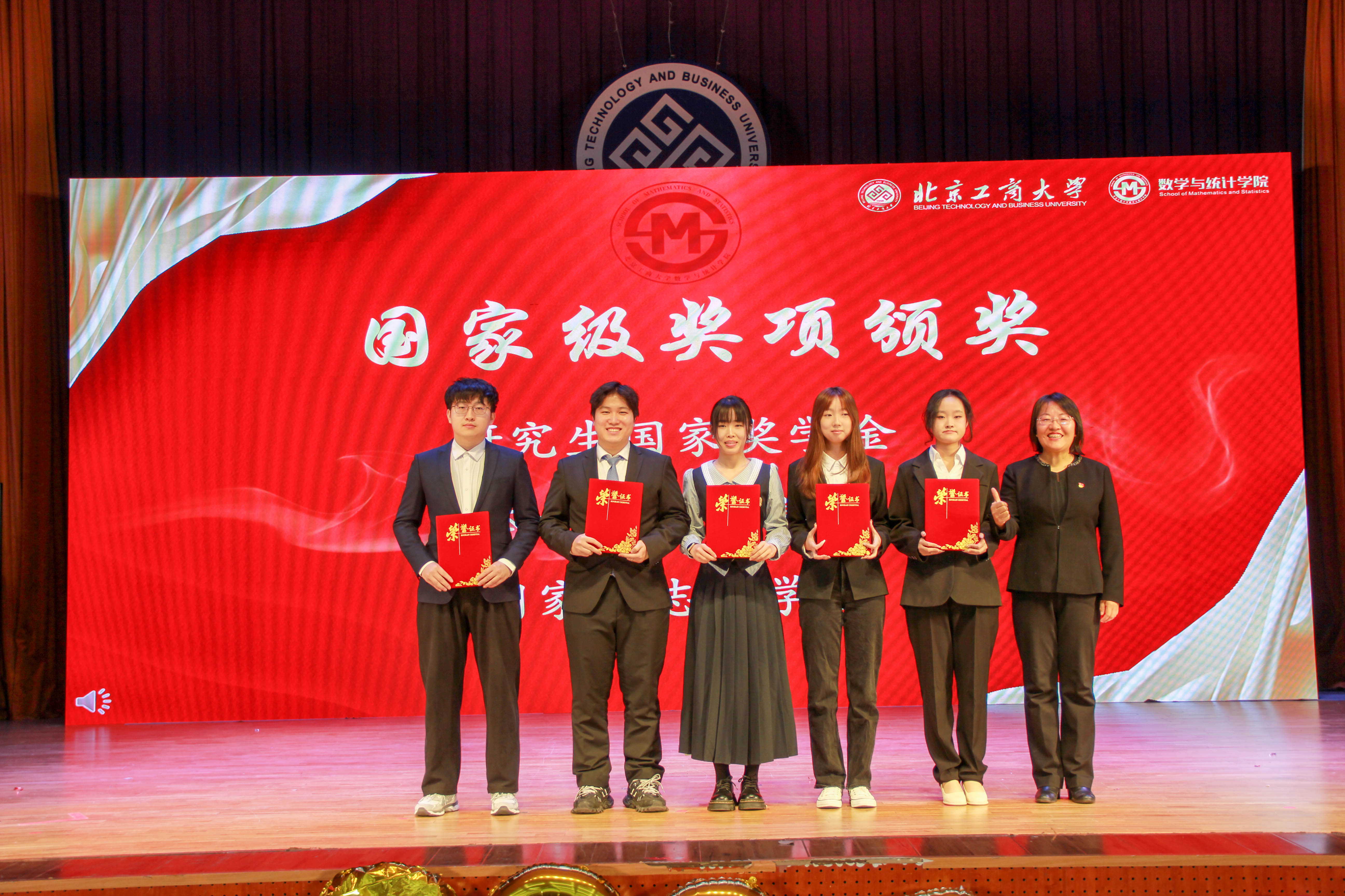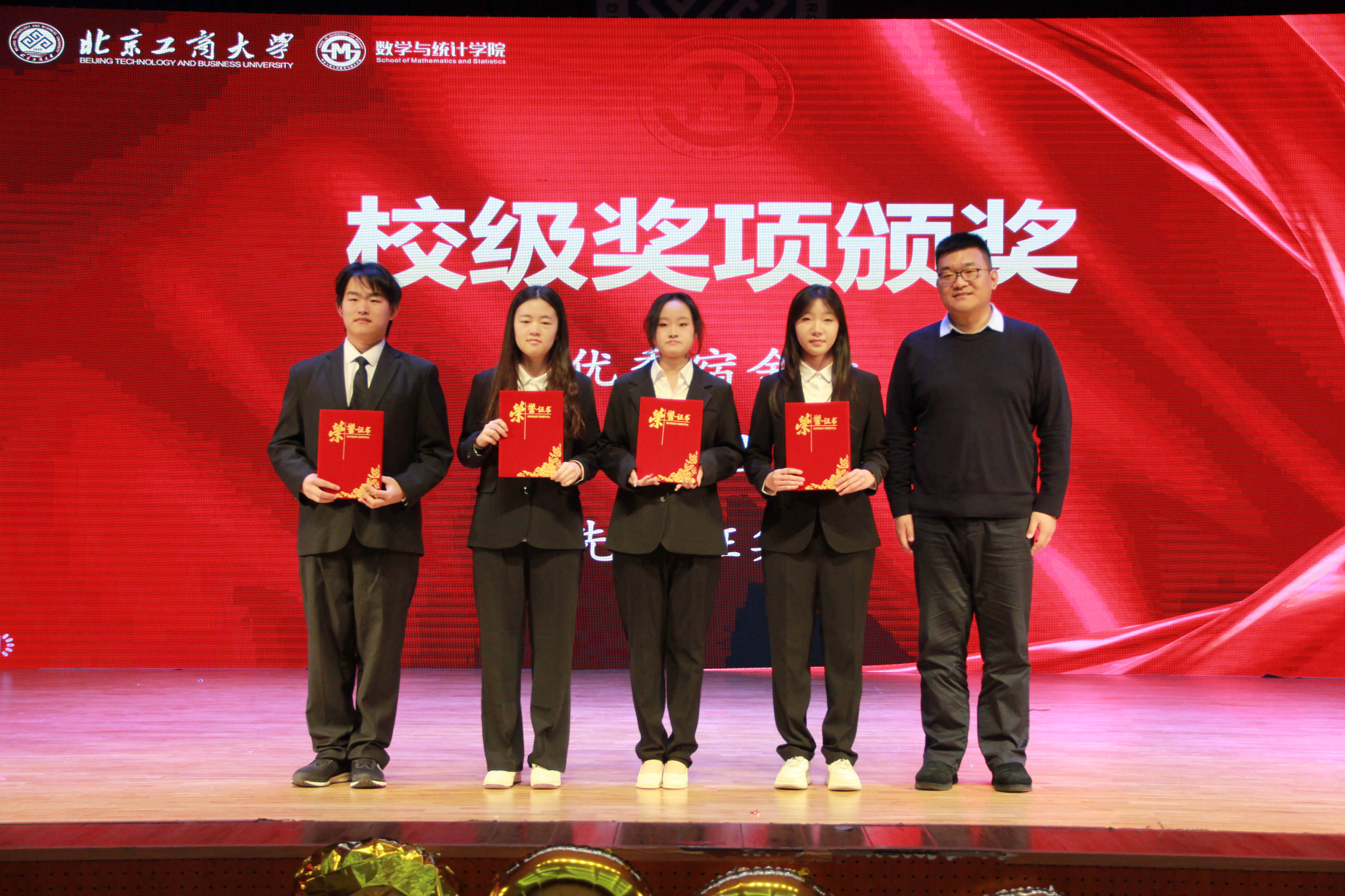 最后,应统23李冰、张盛熹,应统252董欣宜、应统251侯瑞洋四位同学领唱的《相亲相爱》熟悉旋律响起,台上台下齐声高歌,歌声与背景视频中的温情回忆交织,满是数统学院的集体归属感。光影流转间,这场集表彰激励、文艺盛宴于一体的迎新大会圆满落幕。合影定格的瞬间,不仅记录着团圆的温暖,更承载着数统学子逐梦新程的初心与决心。