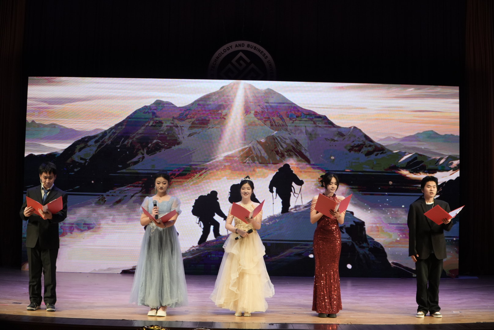 经统24陶昭涵、应统24中外张清桠、应统25中外于蓝、应统252彭刘开泰、经统252谢智灏联袂带来朗诵《数揽新光,统赴韶华》。他们语调铿锵、情感饱满,将数统学科的魅力与学子们的青春抱负娓娓道来。“数揽新光”的志向、“统赴韶华”的决心,深深感染了在场师生,让大家感受到数统学科的独特底蕴与青春力量。