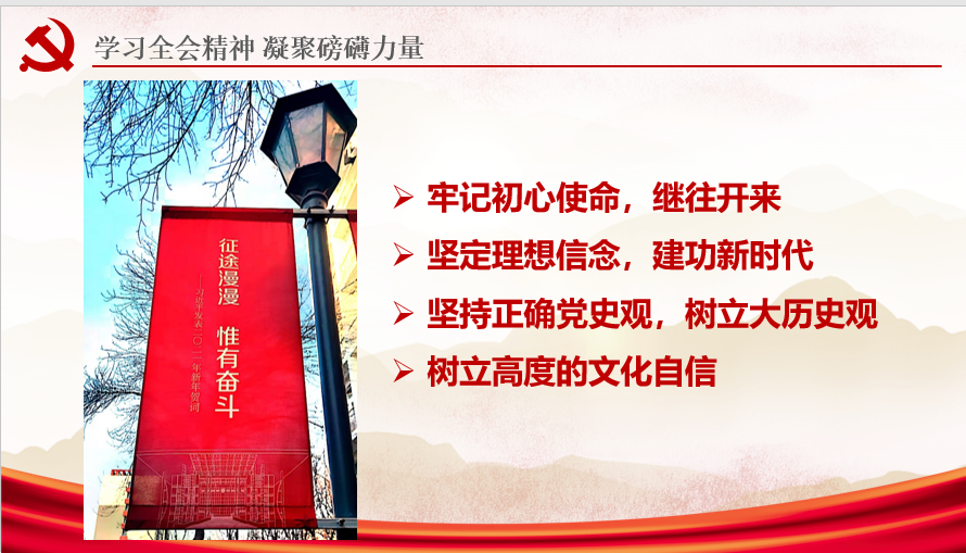 王淳从为什么要总结党的百年奋斗重大成就和历史经验、《中共中央关于党的百年奋斗重大成就和历史经验的决议》的主要内容、“学习全会精神 凝聚磅礴力量”三个方面解读。首先,她从我党历来有总结历史经验的传统和三个需要介绍为什么总结历史经验,接着,她从数说决议的视角,按照“一个牢记”、“两个确立”、“三次飞跃”、“四个时期”、“五点意义”、 “十个坚持”、“十条历史经验”,“十个明确”,新时代党和国家事业取得的“十三个方面“成就的顺序解读决议,并重点解读“共同富裕”的重要地位、理论源起和实现途径。最后结合不同专业发展和需求鼓励大家牢记初心使命,坚定理想信念、建功新时代。