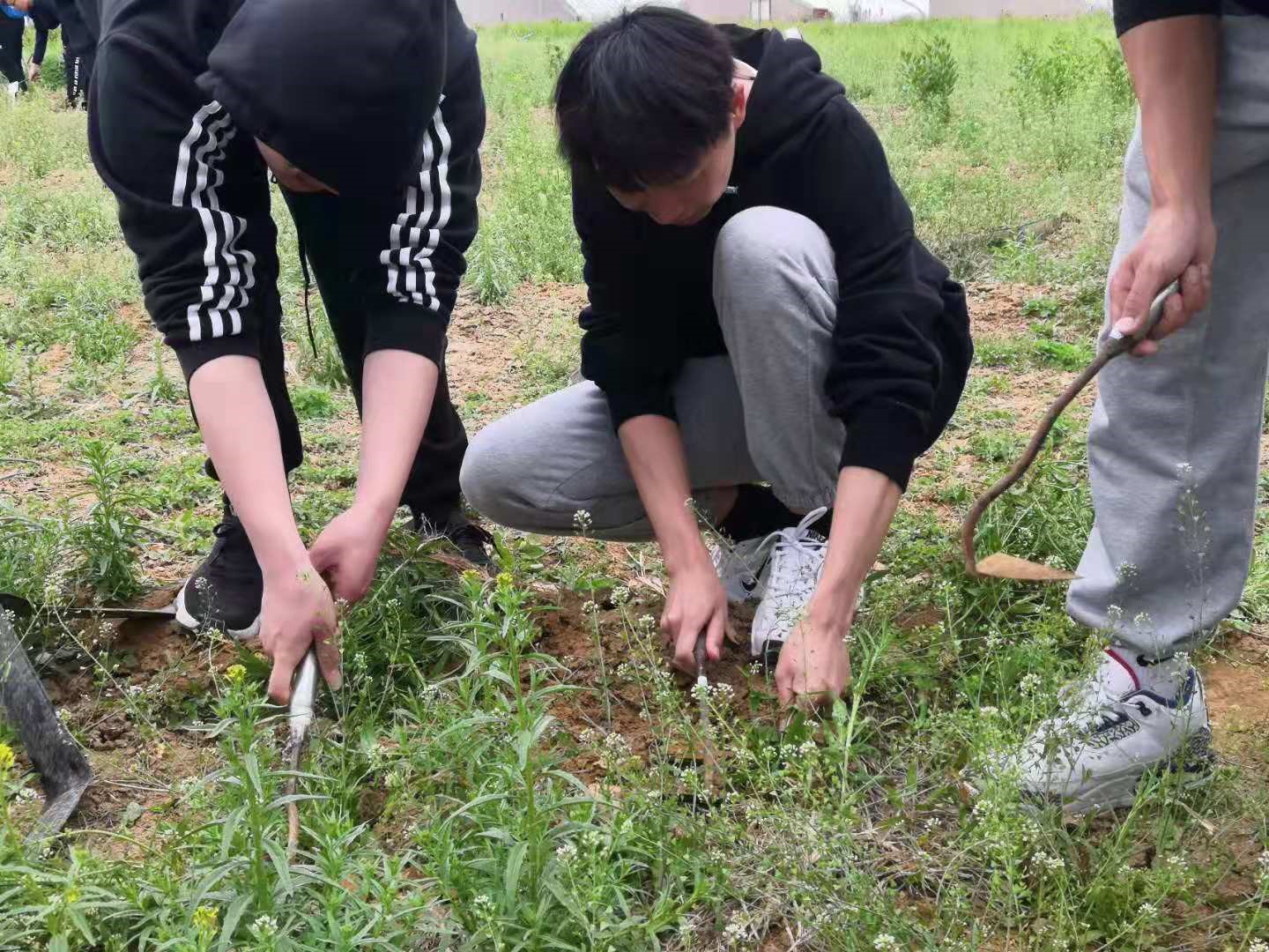 待长达一个小时的辛勤劳动后,农场基地工作人员徐书记用“锄禾日当午,锄禾一定要在晴天,不然就长回来了”一番趣话激起了同学们对农活的热烈兴趣,并对劳动基地和农场负责人进行了简短的介绍,随后由农场负责人为各班级分配任务。男生被分成两组,一组分配至中药培育温室,在指导老师的引导下学习了填板,布种,覆盖等一系列种植工作,另一组被分配至田间地头,他们扛起锄头,将土壤翻新,除去杂草。每个同学都有机会亲自上手一试,慢慢的,由生疏到默契配合,很快的干完了分配的任务。女生们则被分配至大棚,帮助种植户们清理枯枝烂叶,移动花架,扶蔓以固定茎蔓生长方向使植株健壮生长。