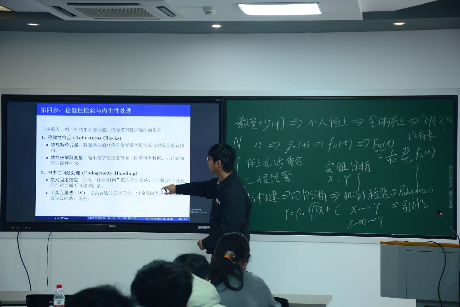 随后,经济学院金融金工241班王毅乐在数学沙龙带来专题分享,展开深入讲解。他以 “基于动力学方程的群体沉默现象建模与仿真”为题,从教室吵闹到个人停止、全体静止的演化过程切入,分享相关动力学模型构建以及实证分析、指标构建、回归分析及机制检验研究流程,还拓展介绍模型在舆论噤声等群体行为分析中的应用价值,其严谨的建模逻辑与跨场景应用思路,引发大家对数学模型应用的深入思考。互动环节中,员工围绕数学学习难点、建模竞赛备考、知识应用等问题深入探讨,思维碰撞不断,大家各抒己见、相互启发,在交流中拓宽视野、补齐短板。