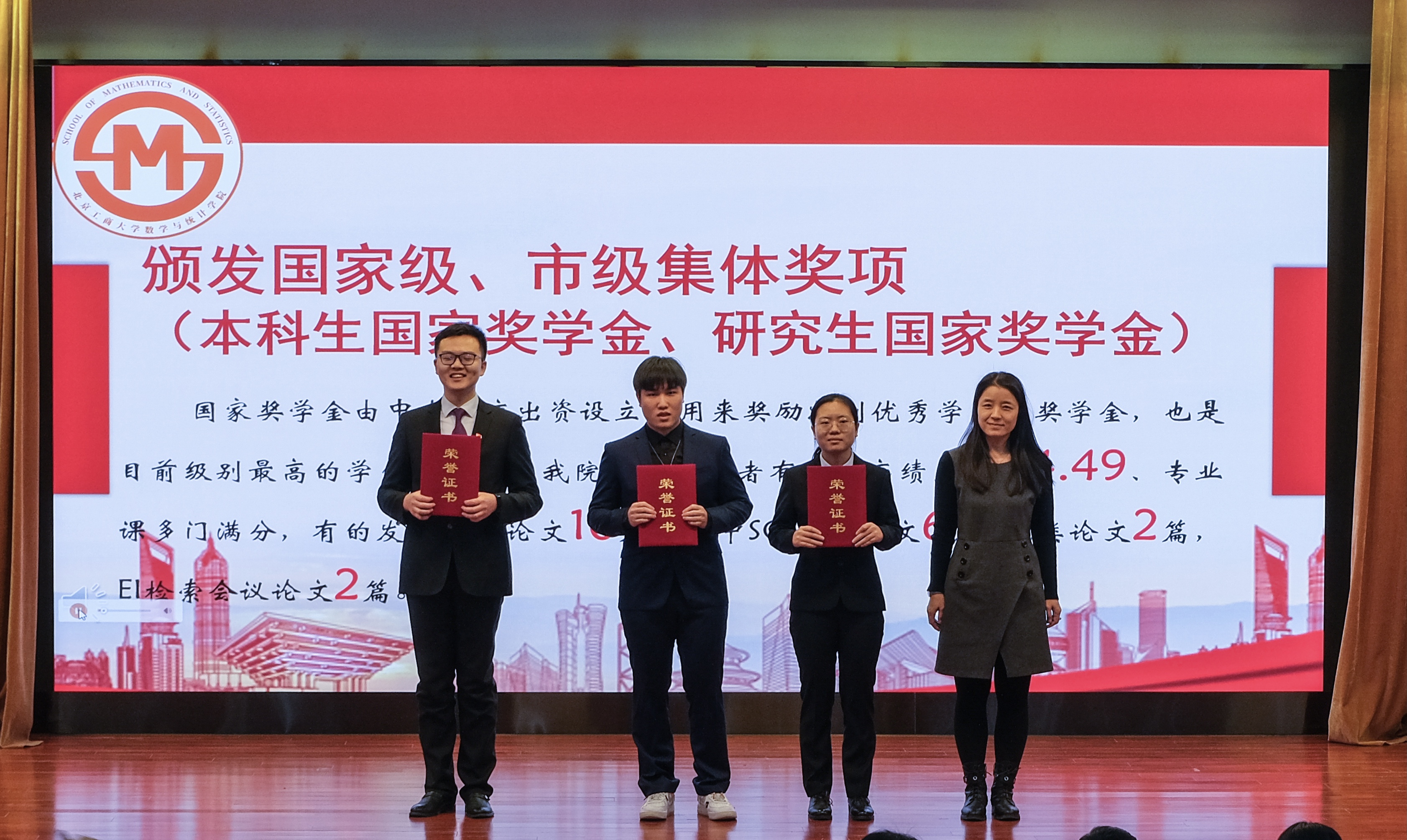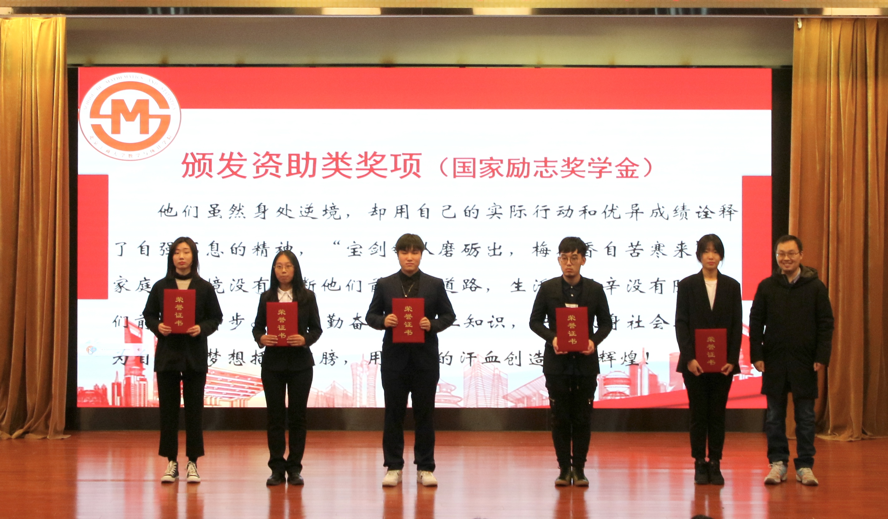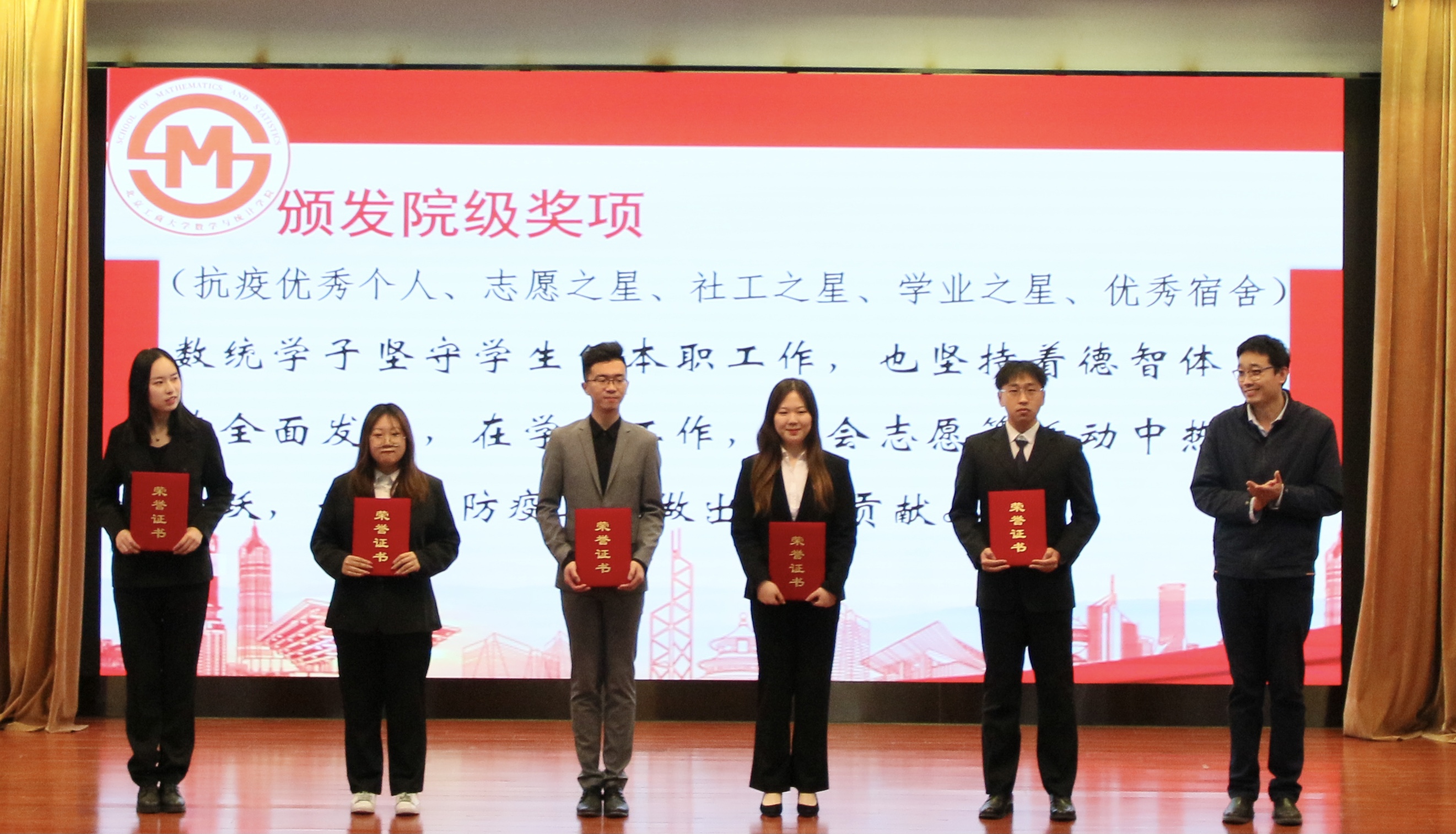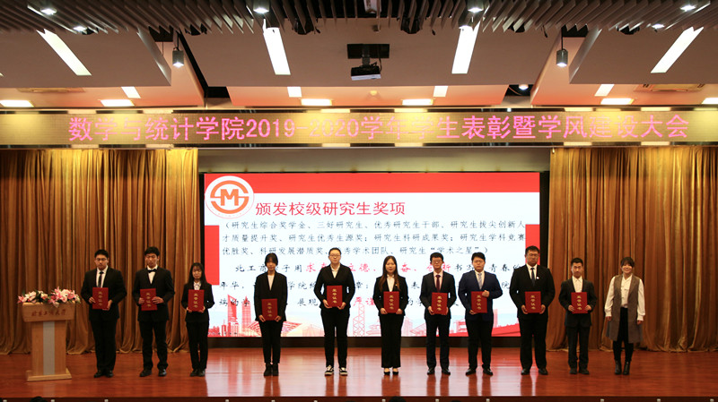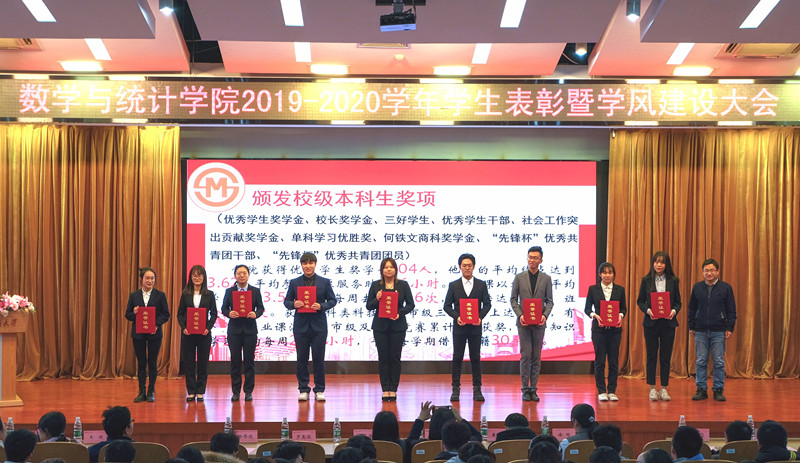 随后进行了奖项颁奖仪式,大会上颁发了国家级、市级奖项(本科生国家奖学金、研究生国家奖学金3人);校级先锋杯优秀团支部(应统17、数学171);校级本科生奖项;校级研究生奖项;资助类奖项(国家励志奖学金3人)以及院级奖项等。