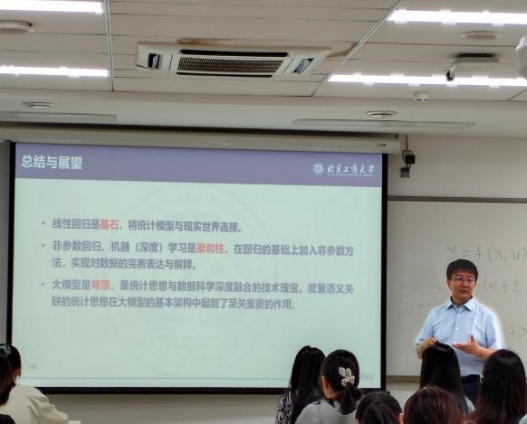 课堂最后,郭建华谈到,线性回归是“基石”,它将统计模型与现实世界连接起来。非参数回归和机器学习是“梁和柱”,在回归的基础上加入非参数方法,实现对数据的完整表达与解释。大模型是“穹顶”,是统计思想与数据科学深度融合的技术瑰宝。度量语义关联的统计思想在大模型的基础框架中起到了至关重要的作用。