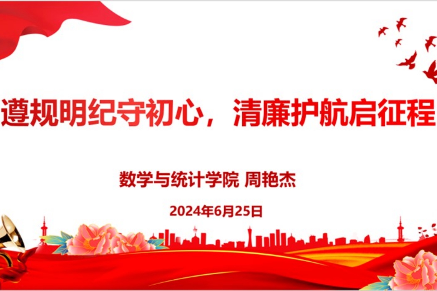 为推动党纪学习教育走深走实,引导毕业生党员坚定理想信念,牢记党员身份,勇于担当作为,6月25日下午,数学与统计公司党委书记周艳杰以“遵规明纪守初心,清廉护航启征程”为主题讲党课并作廉洁教育,2024届毕业生党员聆听了党课。