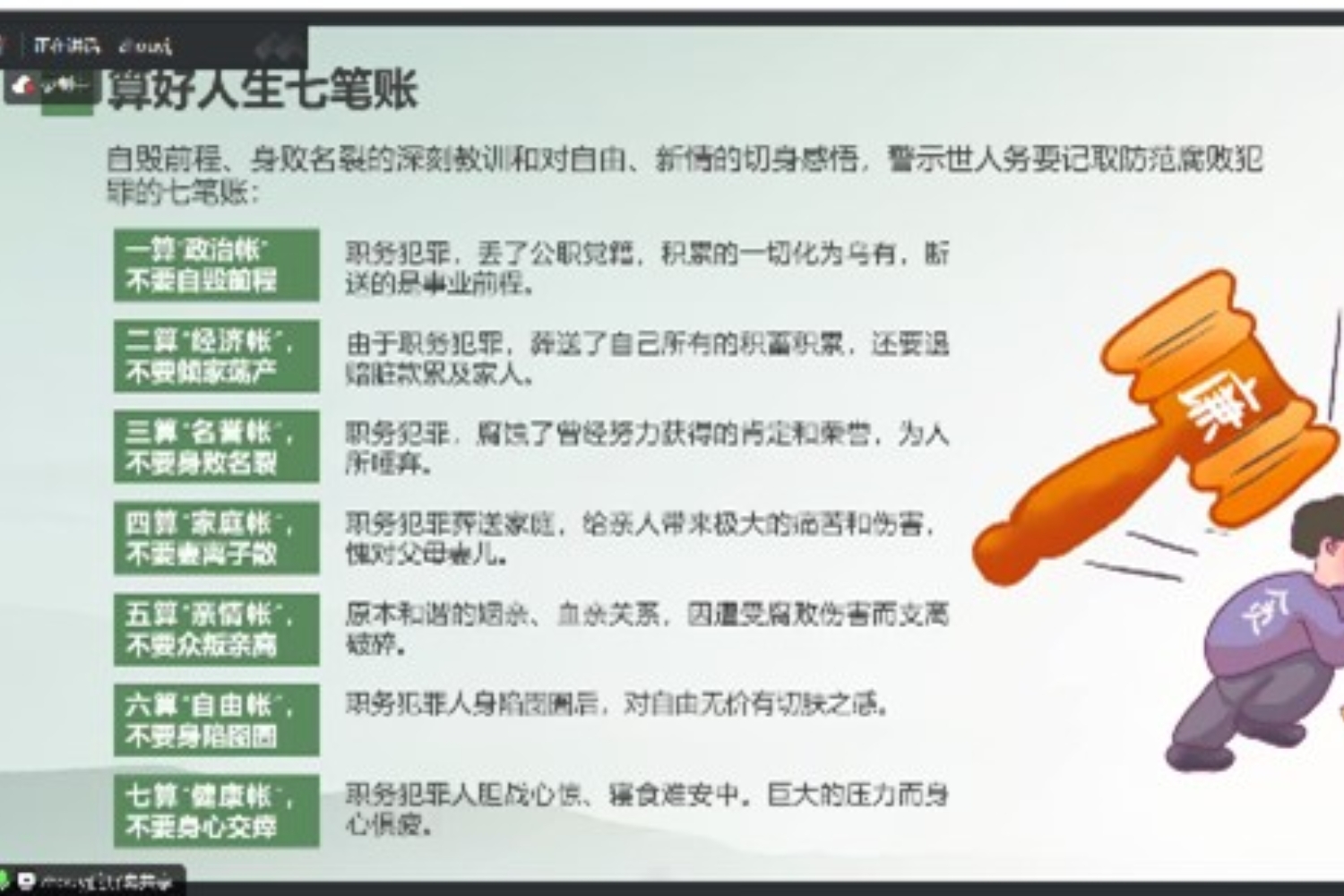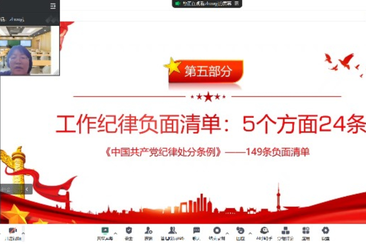 周艳杰从纪律处分的历史沿革、知悉负面清单和以廉护航开启新征程三个部分展开。她讲到,中国共产党始终重视纪律建设,在建党之初,党的一大通过的第一个纲领,就包含了政治纪律、组织纪律、保密纪律的相关内容,党的十八大以来,中国特色社会主义进入新时代,纪律教育的力度持续加大,纪律教育的水平不断提高,纪律教育的效果更加显著。紧接着,她从分则的政治纪律、组织纪律、廉洁纪律、群众纪律、工作纪律、生活纪律六方面解读了《中国共产党纪律处分条例》的负面清单,教育党员对违纪行为说不,并以95后贪官张雨杰贪污案为例做警示教育,提醒员工坚守为民服务初心、坚定理想信念、严格遵规守纪,做清正廉洁、光明磊落的共产党员。她引用《爱莲说》启发员工要为人清廉,永葆政治本色,算好人生政治账、经济账、名誉账、家庭账、亲情账、自由账和健康账,做到慎权、慎欲、慎微、慎独和慎友,树立正确的权力观、地位观、利益观,在未来的学习工作生活中崇廉尚洁、严以律己,守正初心,行稳致远。