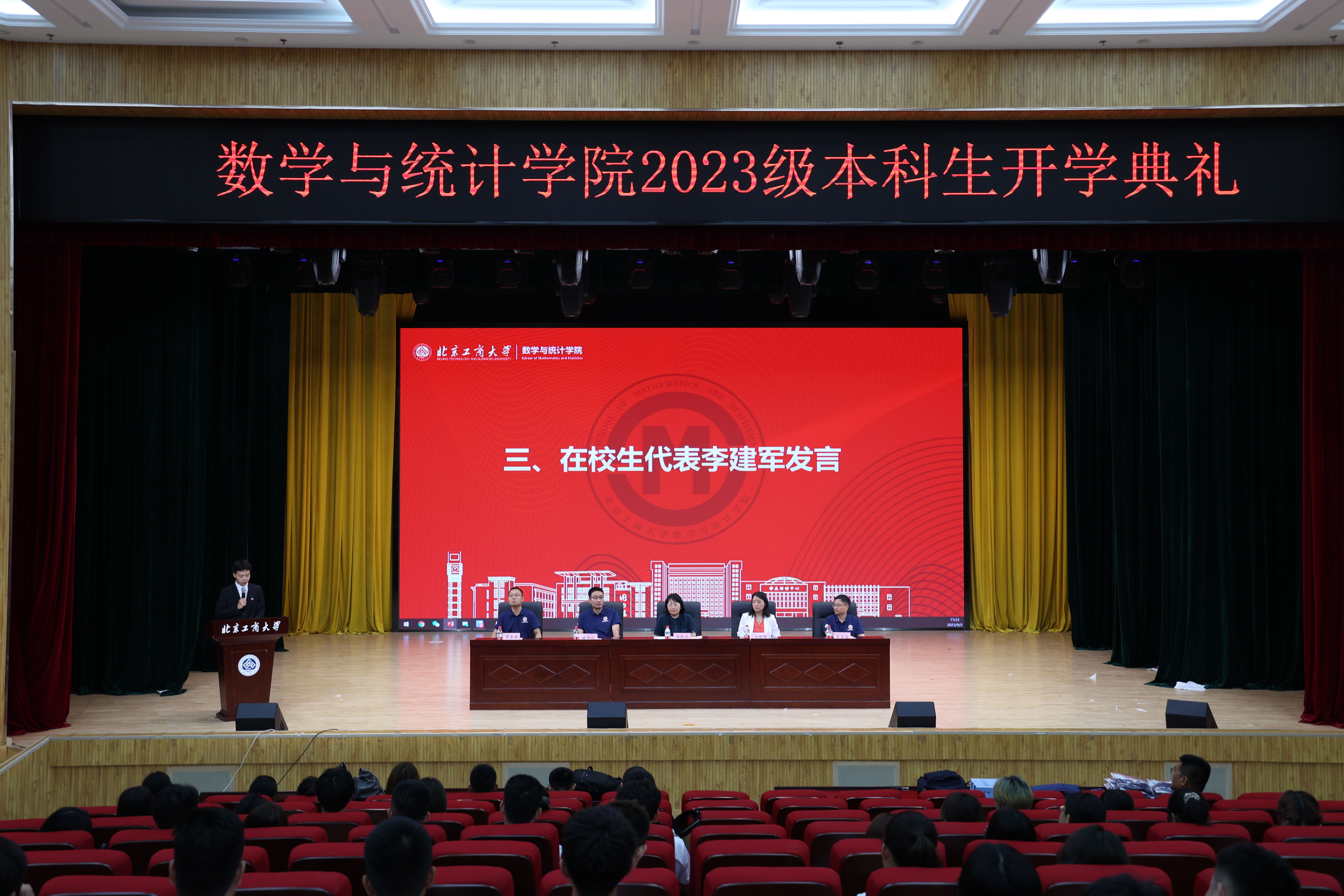 已经有两年老员工活的应统21级学长李建军代表数统学院老生欢迎新生的到来。李建军在典礼上向新生分享了自己两年来在数统学院的种种经历:有来自老师的关切问候、来自同学的关心照顾,也有收获知识的喜悦以及迷茫失意时的鼓励,点点滴滴都是数统大家庭的爱。相信新同学们用心感受数统学院淳朴的师生情、同学情;尽快确定目标、努力学习;踊跃尝试、锻炼自我。快速融入数统学院这个大家庭。