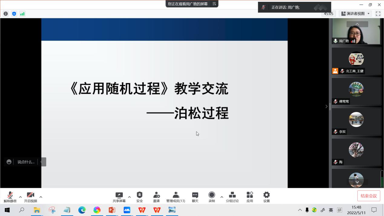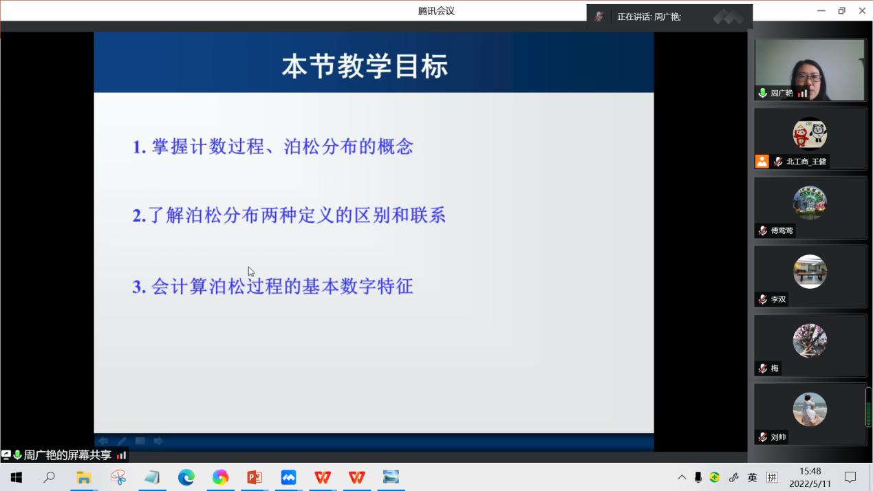 5月11日下午,统计大数据课程组开展第二次教学研讨活动。课程组教师参与了徐美萍老师关于“一元回归分析中最小二乘法的教学与实践”以及周广艳老师关于“《泊松过程》的教学准备与讲授”的教学分享和研讨活动。