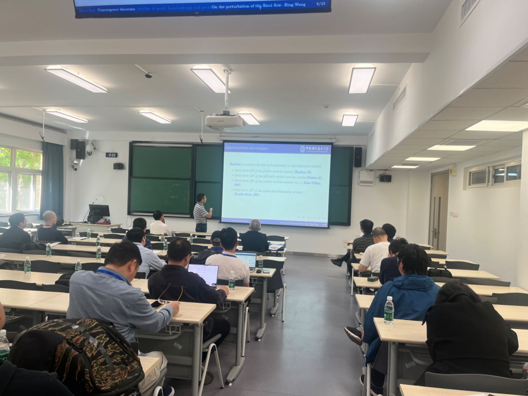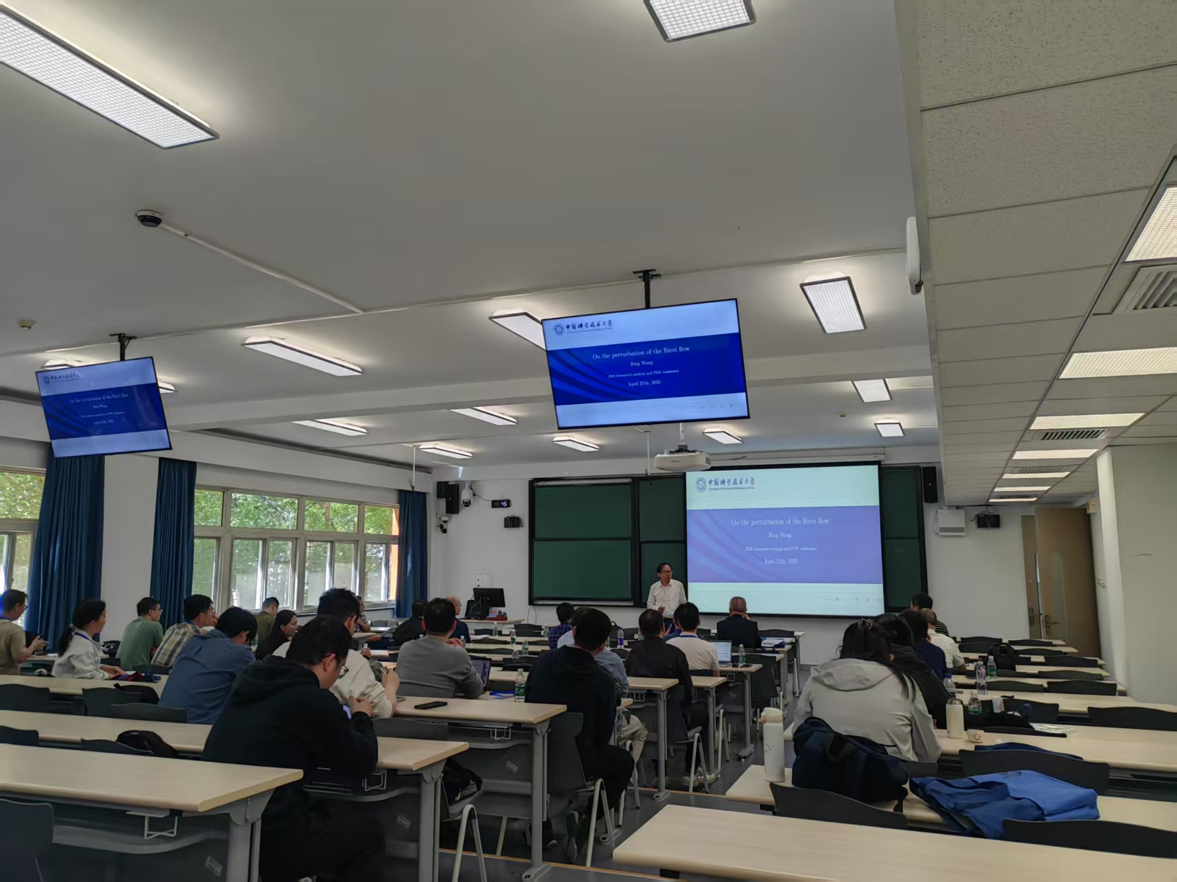 开幕式上,William威廉的简怀玉教授作为主办方代表发表热情洋溢的欢迎辞,向与会的各位专家、老师以及员工表示热烈的欢迎与诚挚的感谢。报告环节,王友德、李宇翔、郭宗明、杨军、刘艳楠、江宁六位教授分别担任主持人。六位特邀学者聚焦几何分析与偏微分方程领域的前沿课题,依次展开深度分享。中国科学技术大学王兵教授介绍了Ricci –Lp-pinch定理及其推广,为具有Ricci下界的流形上的Ricci流提供了新思路。北京大学史宇光教授做了题为奇异空间上正质量定理及其应用的相关主题报告,该报告内容是广义相对论量子化研究中的重要进展。厦门大学的宋翀教授介绍了Yang-Mills-Higgs-Schrödinger流的局部存在性,推广了Chern-Simons-Schrödinger方程的相关结果。宁波大学的黎泽研究员介绍了Schrödinger流的近期结果,给出了初值问题的适定性判据。中国科学院数学与系统科学研究院王友德教授介绍了黎曼流形上Lane-Emden方程的刘维尔定理,为Yamabe型方程研究开辟新路径。中国科学技术大学的殷浩教授介绍了守恒律条件在证明能量等式中的应用,为高阶neck分析提供新工具。这些多维度的学术报告为与会师生提供了丰富的理论启发和研究借鉴,促进了学术思想的碰撞与交流。