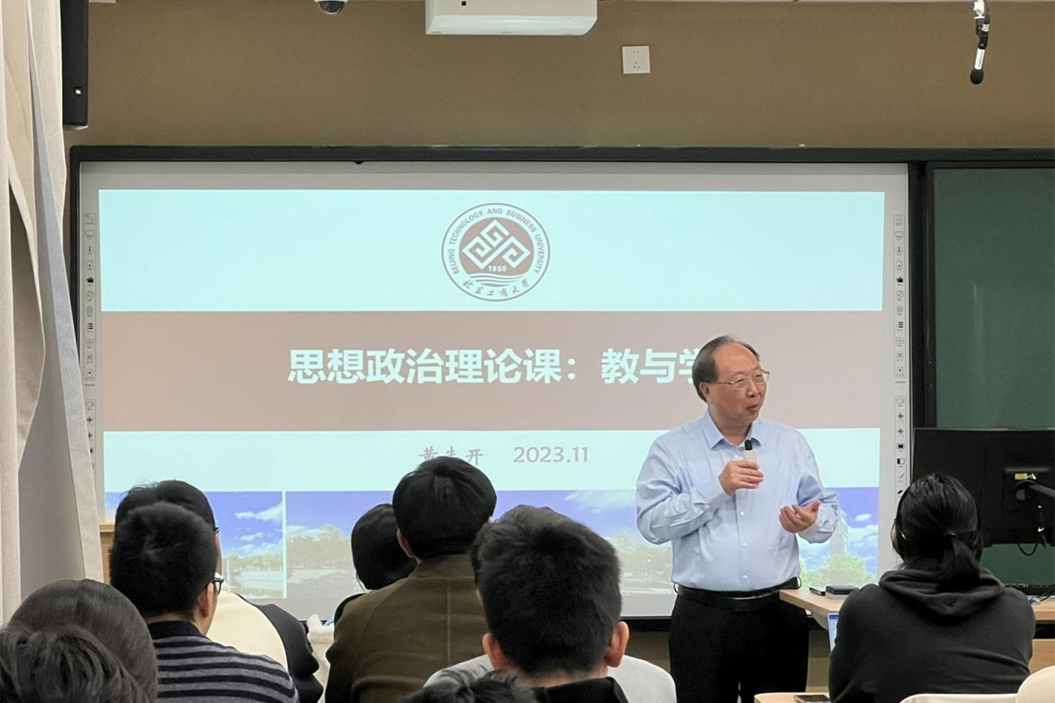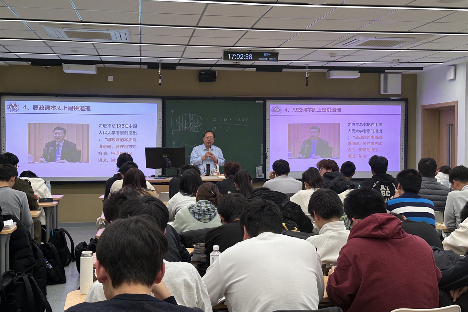 黄先开以《思想政治理论课:教与学》为主题,对比自然科学与社会科学异同之处,讲授了一堂生动的思政课,让同学们认识到了思政课的重要性。他以复杂图形面积计算化繁为简、计算机模拟现实为例,引出自然科学是研究自然界发展变迁规律的科学,再将视角拉入巴以冲突,得出社会科学是研究社会发展变迁一般规律的科学,社会科学带有鲜明的观点、立场,启发同学们在思政课堂上要多思考多交流,做到心怀“国之大者”。他引用习近平总书记考察中国人民大学时的讲话,“思政课的本质是讲道理,要注重方式方法,把道理讲深、讲透、讲活”,讲解了思想政治理论课在落实立德树人根本任务、培养科学思维以及谋划学校发展的重要性。他直面员工对思政课的感受,提出教师要做到政治强、情怀深、思维新、视野广、自律严、人格正,员工要敢于质疑问难,两个主体共同发力,增进互动合作,提高课堂教学质量。期望同学们把实现个人价值同学校发展、社会发展紧紧联系在一起,增强责任感使命感。