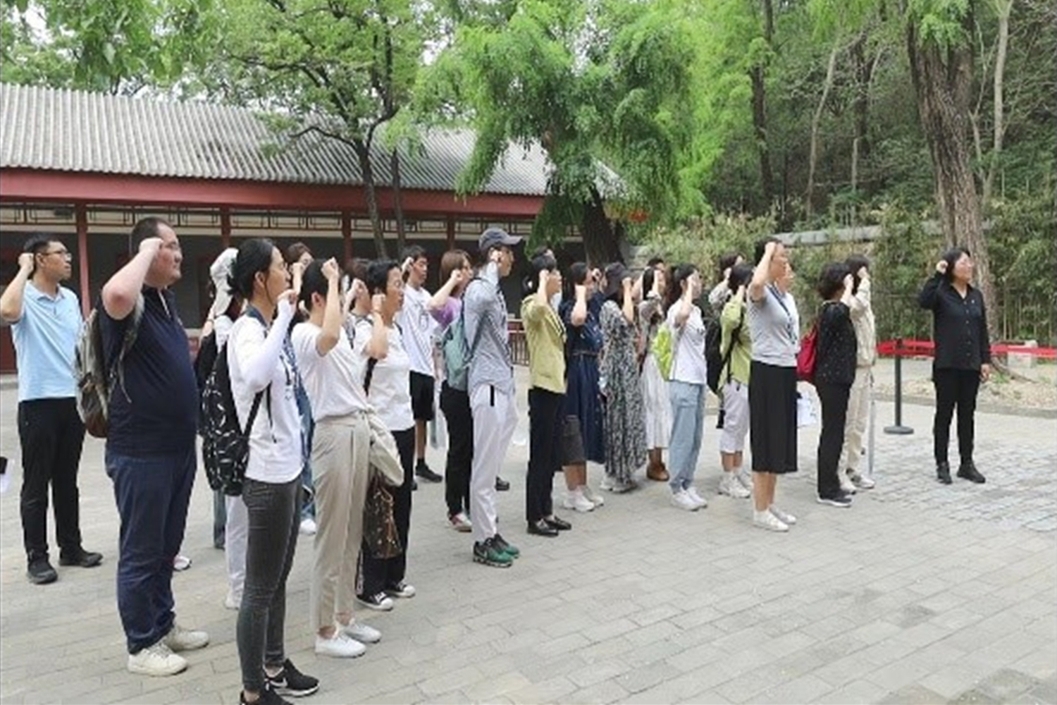 1949年3月25日,中共中央、中央军委机关进驻北平后,在双清别墅居住和办公。双清别墅是中国共产党“进京赶考”第一站,曾是中共中央的指挥中心,见证了中国革命走向胜利的历程。循着蜿蜒的山路盘旋,第一站抵达的是双清别墅的警卫处旧址。鲜艳的党旗矗立于院子中央,仿佛一盏不灭的明灯。公司党委书记周艳杰领誓,师生党员面向党旗重温入党誓词。