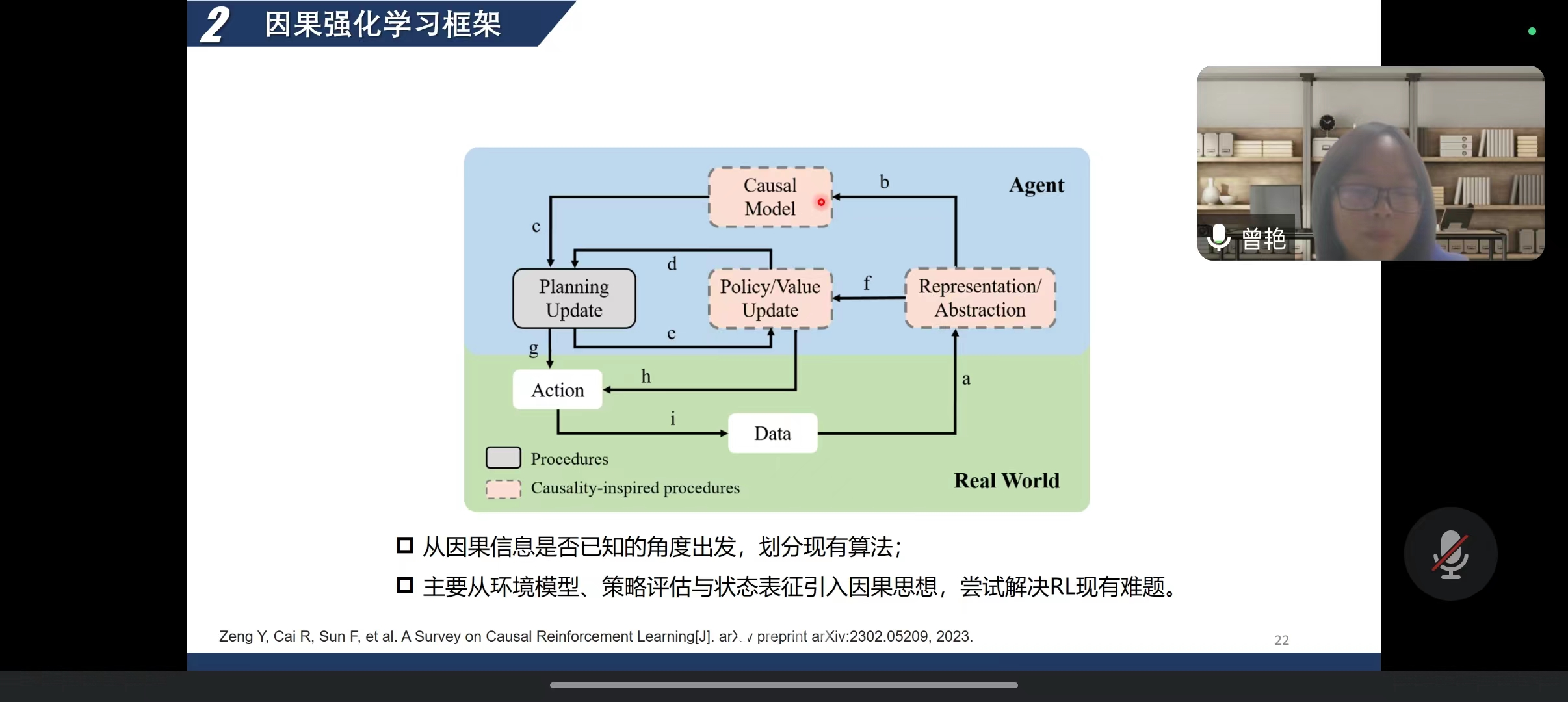 曾艳老师结合《A Survey on Causal Reinforcement Learning》一文,讲解了目前因果强化学习的动机、基本问题、研究进展以及未来可能的研究方向。曾老师首先介绍了因果强化学习的由来,依次从强化学习和因果的角度,分析了两门学科融合发展的必要性,总结了强化学习的数据效率低、模型解释难与策略迁移弱等问题,并讨论了因果在解决这些问题方面具有很大的潜力,强调了因果发现与推断的重要性。紧接着,她分享了现有因果强化学习方法的研究框架、分类标准与对应的研究范式,并依次介绍了因果信息已知、因果信息未知情况下的代表性工作。最后,总结了未来因果强化学习的发展方向与自身的研究兴趣。