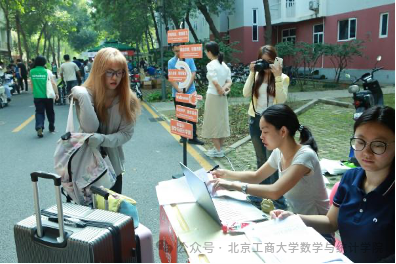 研究生新生们手持录取通知书,陆续抵达学院报到处。学院老师们与志愿者们早已准备就绪。老师们现场疏导人流、指引路线,确保报到通道畅通无阻;志愿者们佩戴醒目标识,驻守在校门、报到处及服务岗亭,耐心地为新生及家长提供报到指引、流程讲解,并主动协助搬运行李,以实际行动传递温暖。