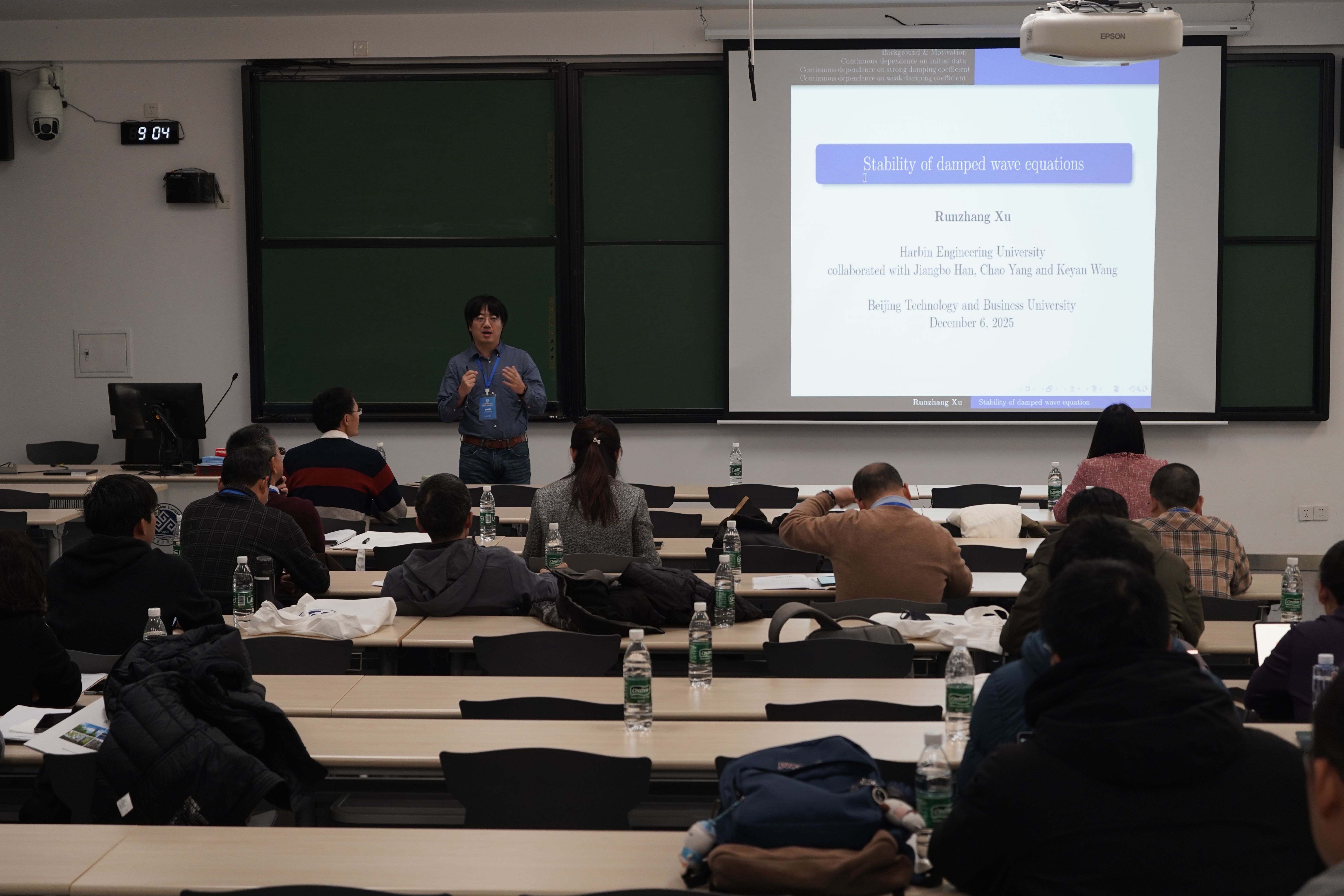 报告环节由唐梓洲、彦文娇、张希、宋翀、杨晓奎、莫小欢、周蜀林、白学利、李奇睿、陈世炳、郑有泉、黄耿耿、周斌、韩小利、王征平等15位教授轮流主持,学术交流高效有序。十五位特邀学者分别作了专题报告,集中探讨了非线性偏微分方程与几何分析领域的核心议题,内容覆盖完全非线性椭圆与抛物方程、凸几何与几何测度论、几何分析与流形PDE、非线性发展方程的定性理论、非局部算子与方程、非线性色散方程与物理模型,以及函数空间与临界不等式等前沿方向。徐润章教授对波动方程的全局量化稳定性进行了深入分析;保继光教授探讨了抛物型Monge-Ampère方程抛物凸古代解的性质研究、黄勇教授从几何测度论出发探索了重建凸体一系列问题,孙玉华教授研究了流形上椭圆不等式组解的存在性与临界条件。另外,魏雅薇教授聚焦于退化拟线性椭圆方程正则性理论、吴雅萍教授针对退化移动环境中反应扩散方程行波解的动力学行为、罗肖教授对于具有排斥‑吸引核的Hartree方程相关猜想、杨军教授对于玻色‑爱因斯坦凝聚的Gross-Pitaevskii模型的曲线集中解的研究与构造、陶春霞教授针对高阶Hardy-Sobolev不等式极值函数的研究分别开展了报告。此外,会议期间熊革教授围绕Minkowski不等式的稳定性、矫贺明教授围绕分数阶Hessian 方程、李俊钢教授围绕Hardy-Adams不等式、朱茂春教授围绕Trudinger-Moser不等式、窦井波教授围绕各向异性Onofri不等式、涂绪山博士围绕Monge-Ampère障碍问题,分别分享了各自的研究成果与最新进展。多维度的报告从理论深度与应用广度,全景式地展现了该领域的蓬勃活力,为与会师生提供了丰富的学术启发,有效促进了前沿思想的深度碰撞与学科交叉融合。