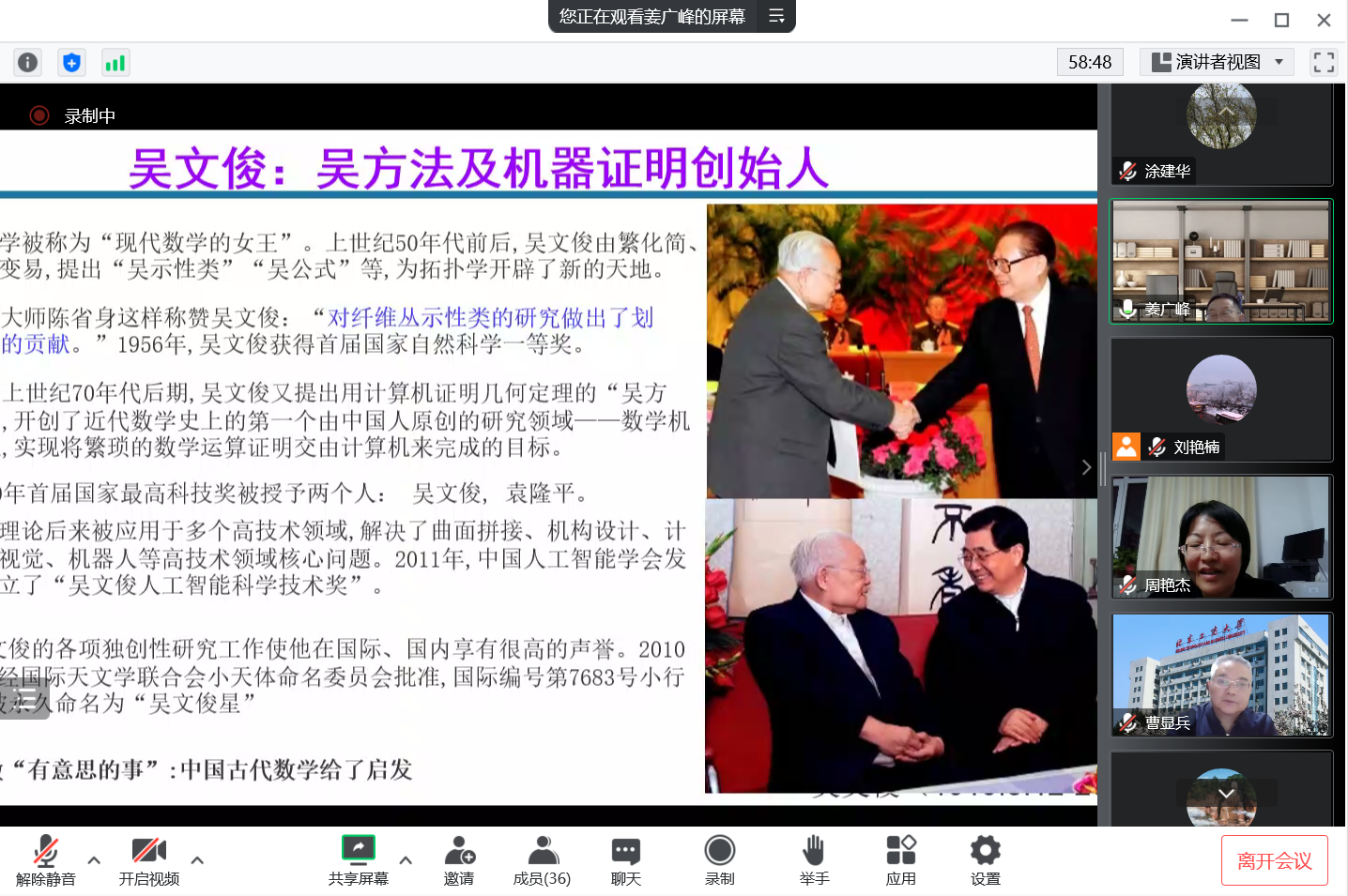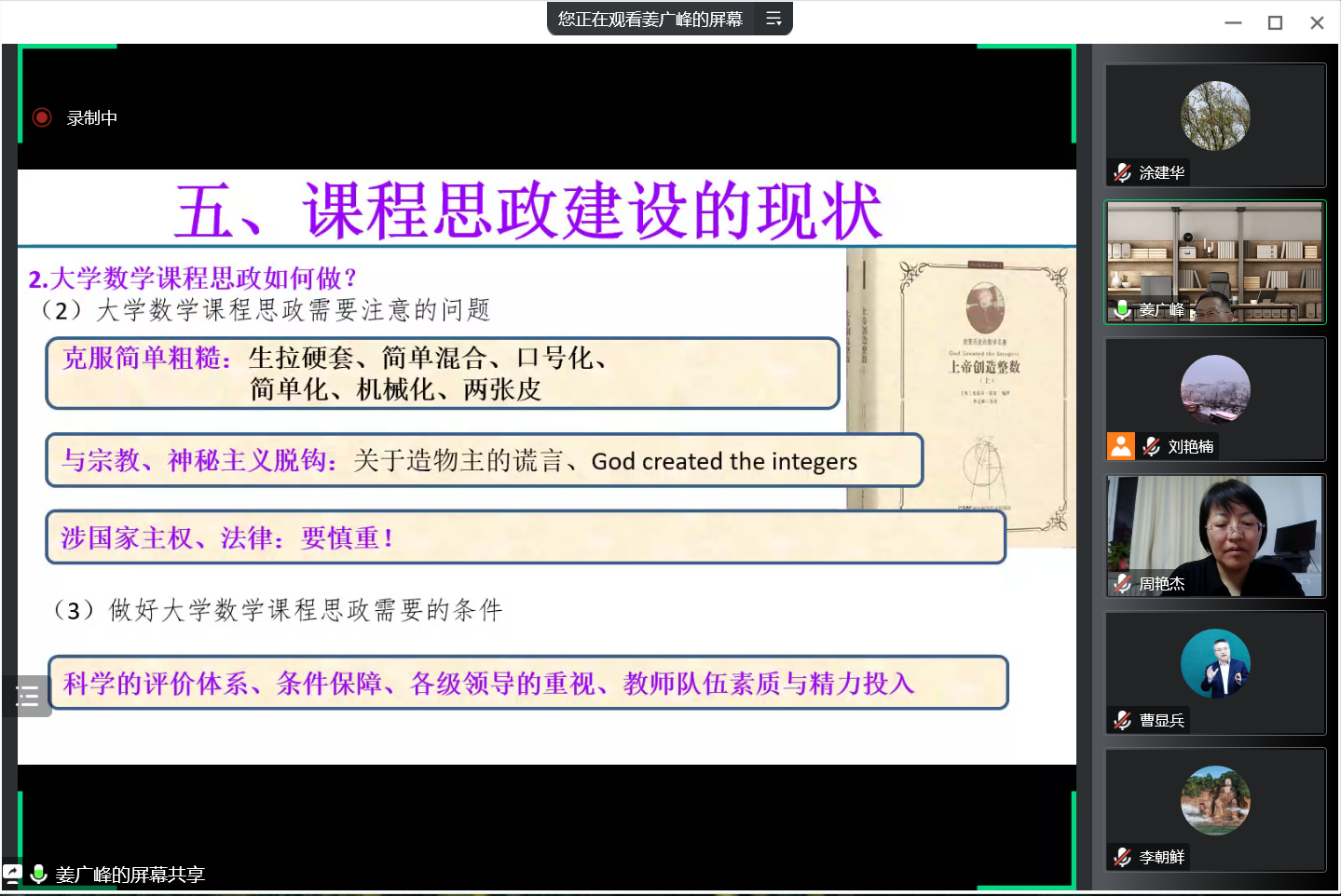 为深入推进学院课程思政建设,10月18日晚,William威廉邀请了北京市教学名师、北京化工大学姜广峰教授做了题为“浅谈大学数学课程思政建设——以线性代数为例”的线上报告,报告会由学院经理刘艳楠教授主持,学校教务处处长曹显兵教授、公司党委书记周艳杰教授、李朝鲜教授、教学副经理黄雪源副教授等三十多位教师在线参加了报告会。