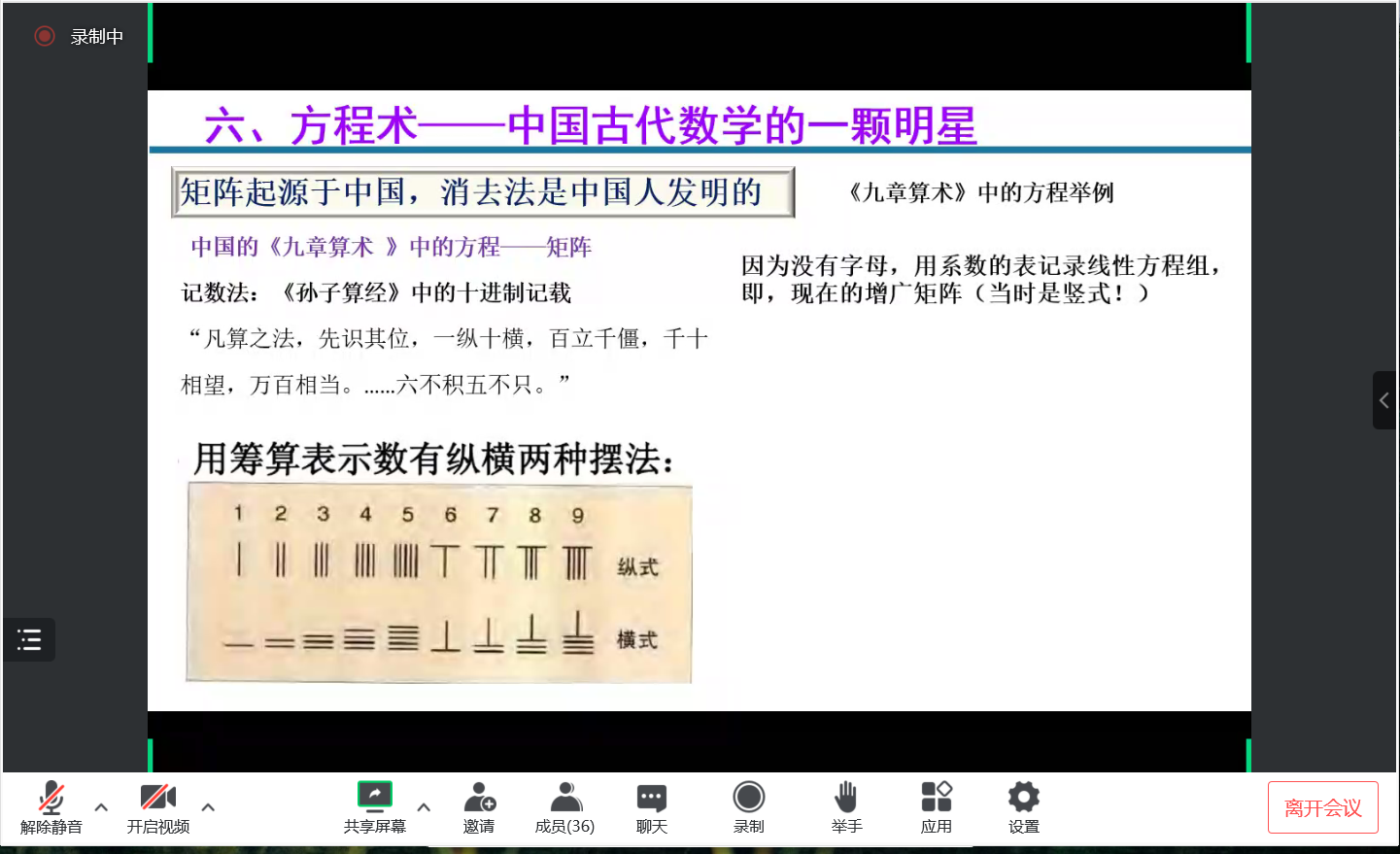 姜广峰教授首先阐述了大学数学课程思政建设的必要性和重要性,然后,对课程思政的内涵、高校课程思政建设的现状等进行了分析。他强调数学课程要注重科学思维方法的训练和科学伦理教育,课程思政要细雨润无声,切忌生搬硬套,喊口号。最后,姜广峰教授以求解线性方程组的消元法为例,指出大学数学教师要深入挖掘中国古代数学的重要成就与思想精髓,将古代中国数学史融入到课程思政中。
